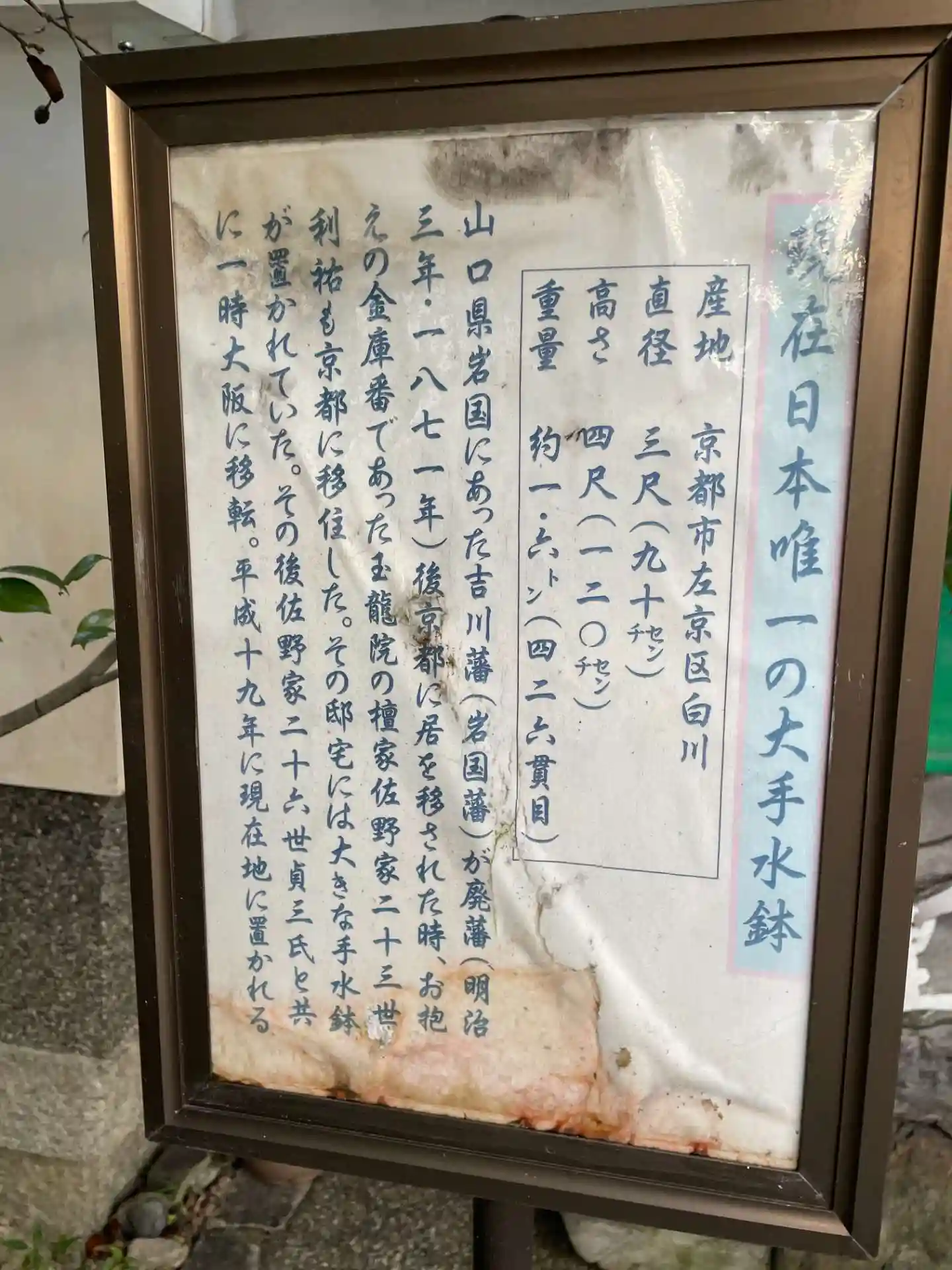 山口県の吉川藩の金庫番 佐野家が明治時代に京都に移住した際 この大手水鉢をもってきたそうです。