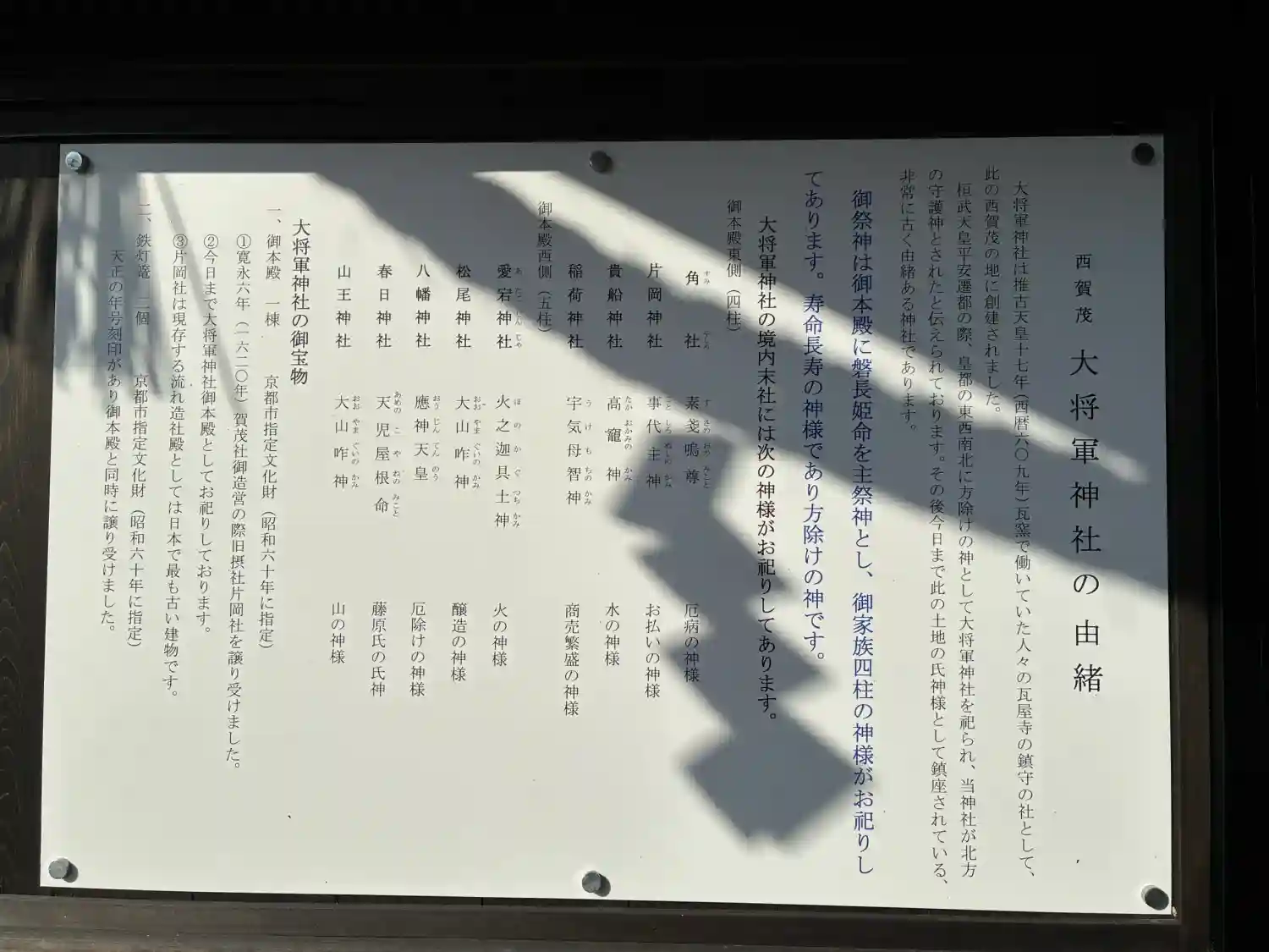 京都市内に複数の「大将軍神社・大将軍社」が存在することから それらを区別するために西賀茂大将軍神社と呼称することもある。