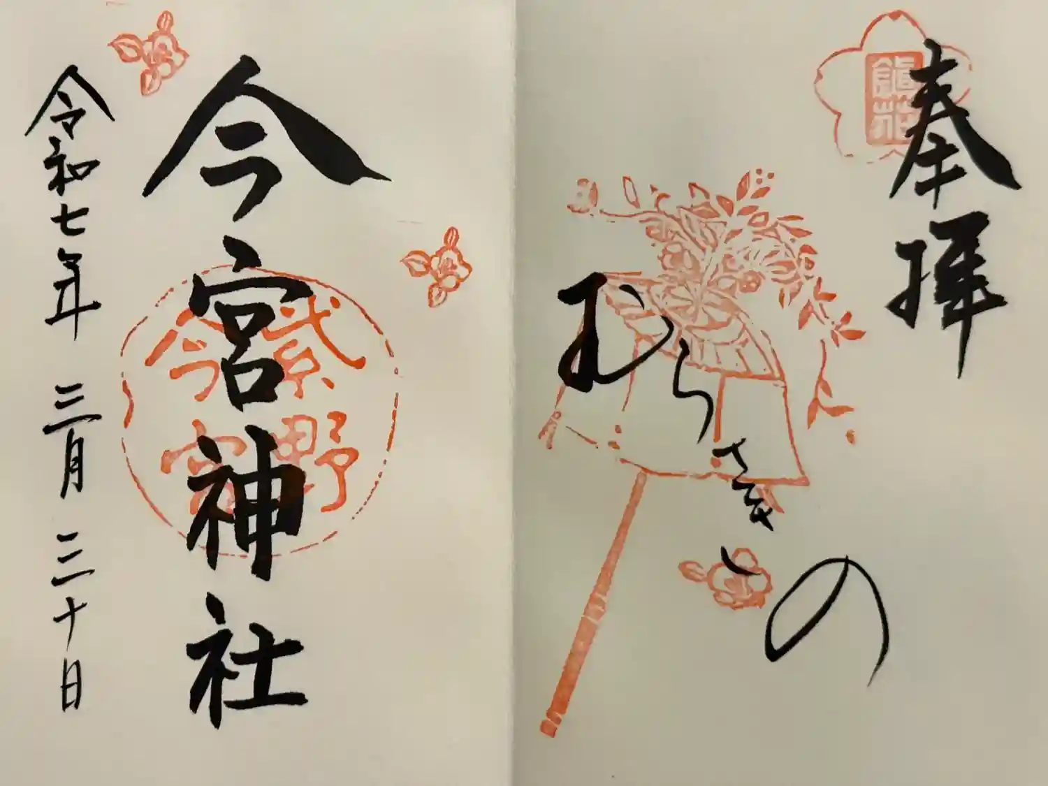 「花鎮めのやすらい祭」で知られる今宮神社の印は、桜に「鎮花」の文字が記されたものや花傘のモチーフが可愛いです! | |||