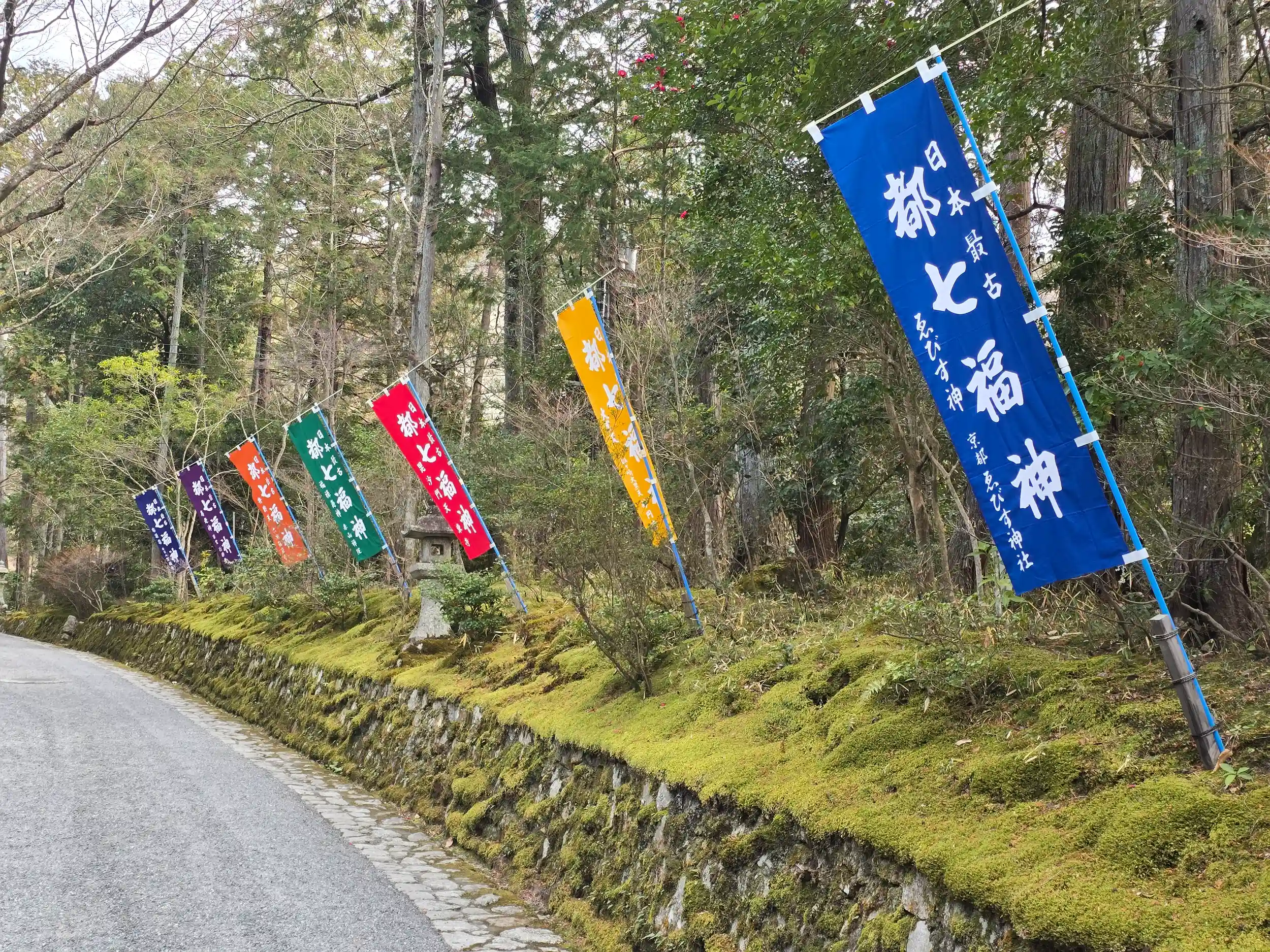 一の鳥居を抜けて山門を潜り、七福神の華やかな幟を眼で楽しみながら参道を歩き、左に曲がり境内への石段を上ると真正面に拝殿が見えます。