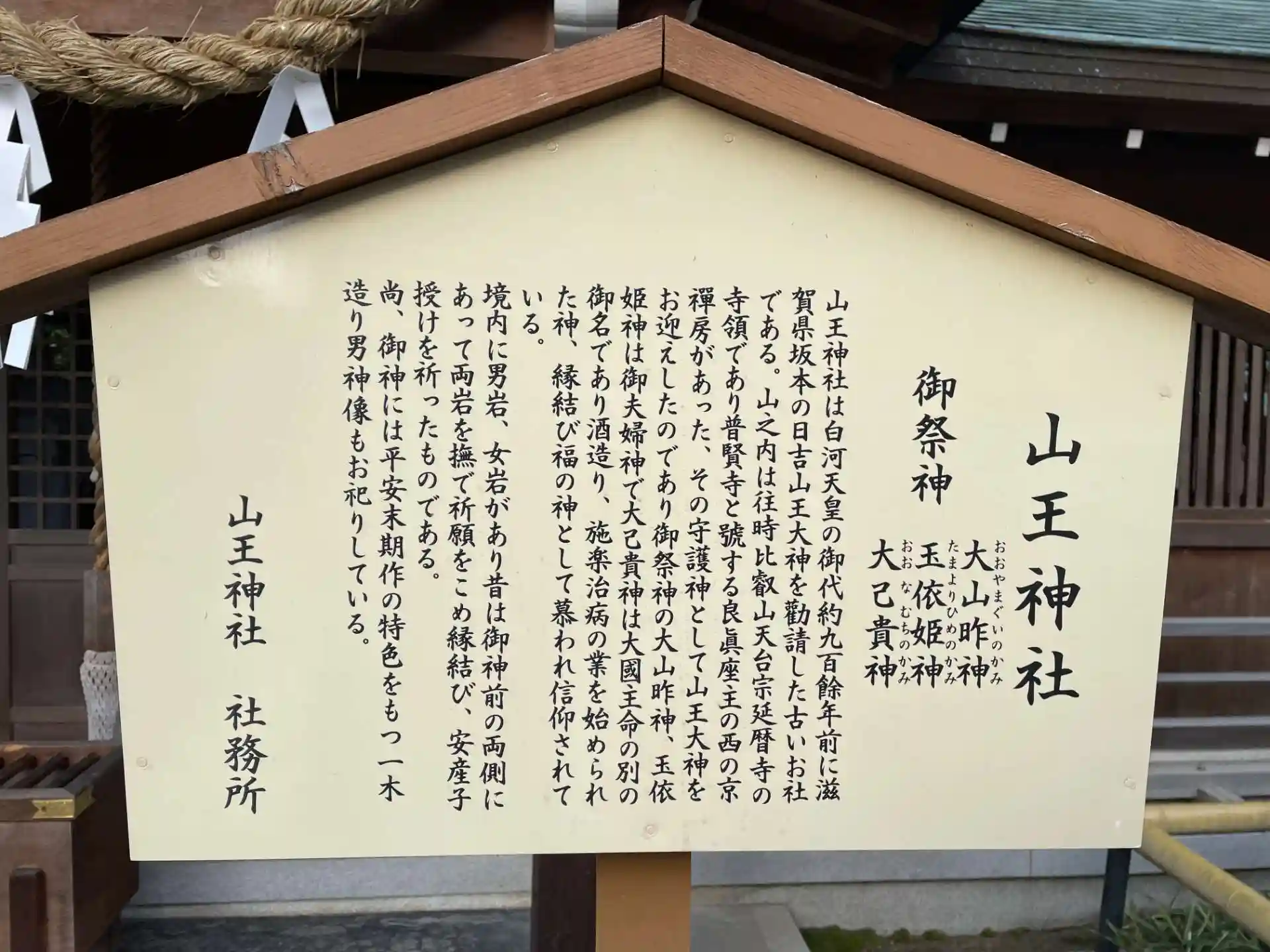 祭神として大山咋神(おおやまくいのかみ)と玉依姫神(たまよりひめのかみ)の夫婦神と 大国主命の別名である大己貴神(おおなむちのかみ)を祀り 方除け 厄除け 縁結び 安産 子授け 夫婦円満などのご利益で知られています。
