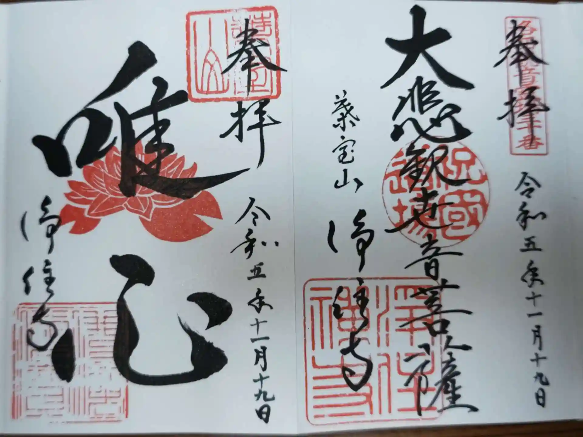 通常の御朱印と特別公開限定の御朱印『唯心』。