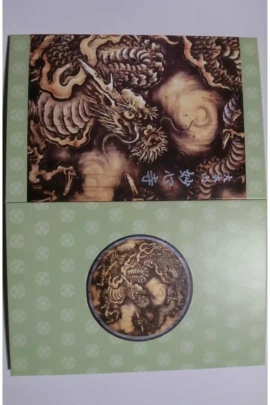 薄緑色の地に妙心寺八つ藤紋文様が施され、両面に妙心寺法堂『雲龍図』がデザインされた御朱印帳で、表面右上に大本山妙心寺の文字が入っています。