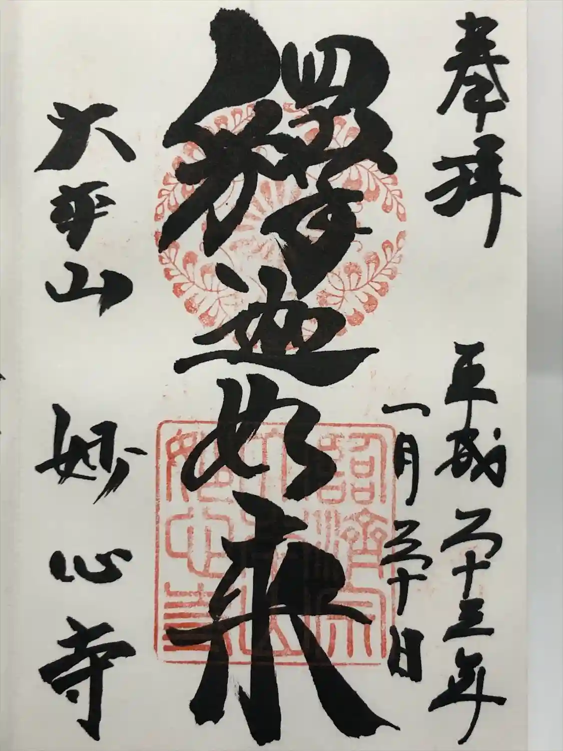 真ん中に大佛宝殿と書かれ、上部に妙心寺八つ藤紋の印、下部に臨済宗大本山妙心寺の印、左下に大本山妙心寺の文字が入っています。