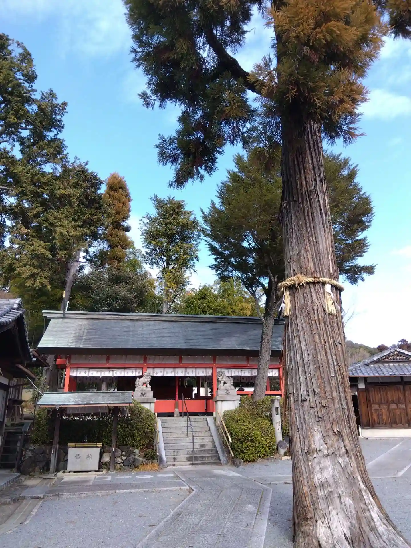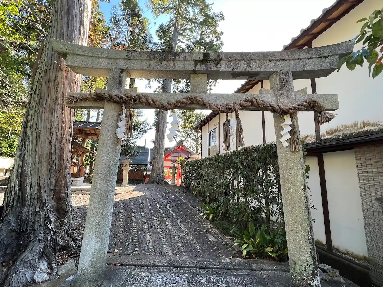 きぬかけの道沿いにある神社、きぬかけの道に面して鳥居がありますがここからは入れない様子です。玉垣に…