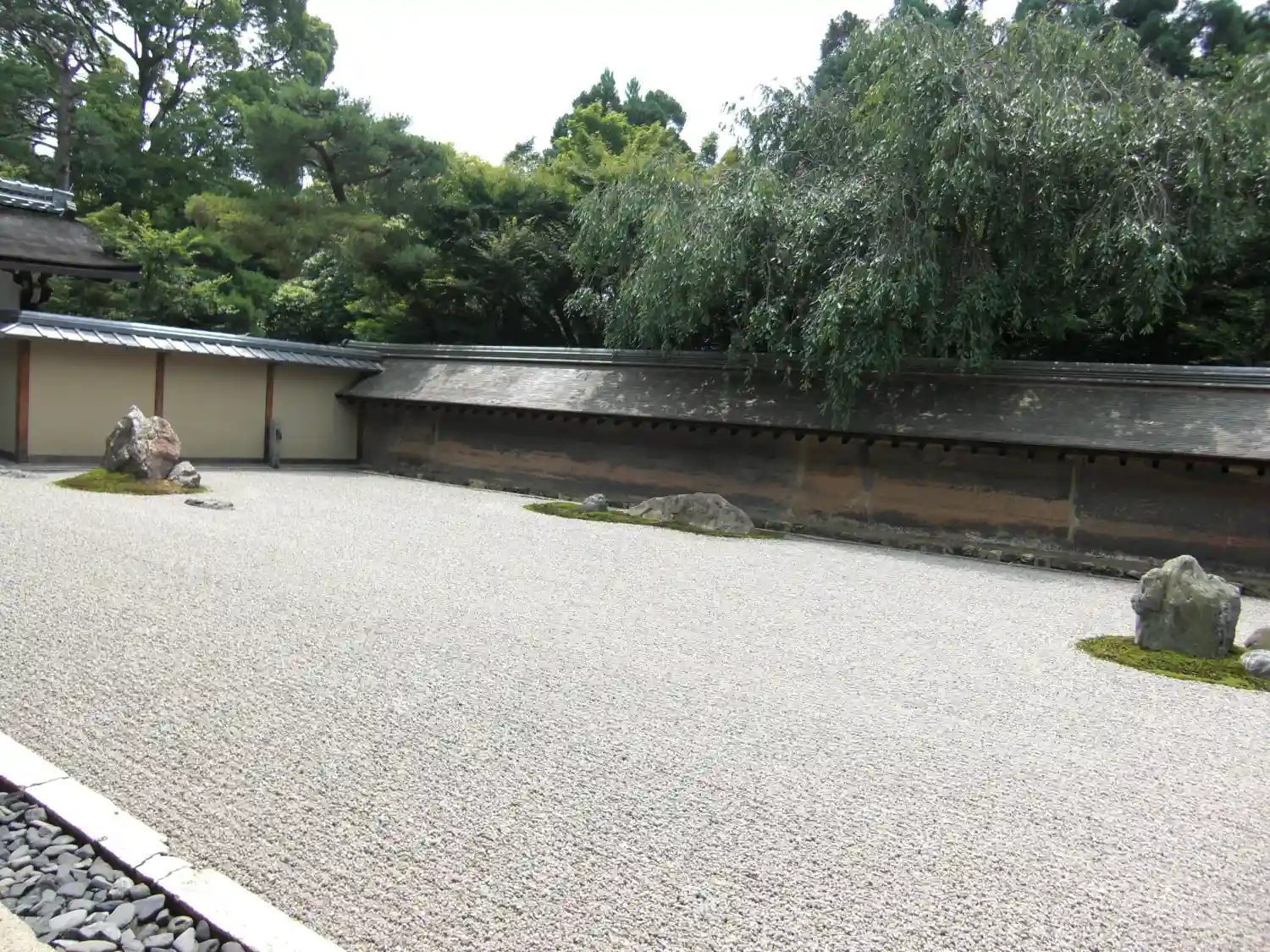 幅25メートル 奥行10メートルほどの空間に白砂を敷き詰め 東から5個 2個 3個 2個 3個の合わせて15の大小の石を配置する。