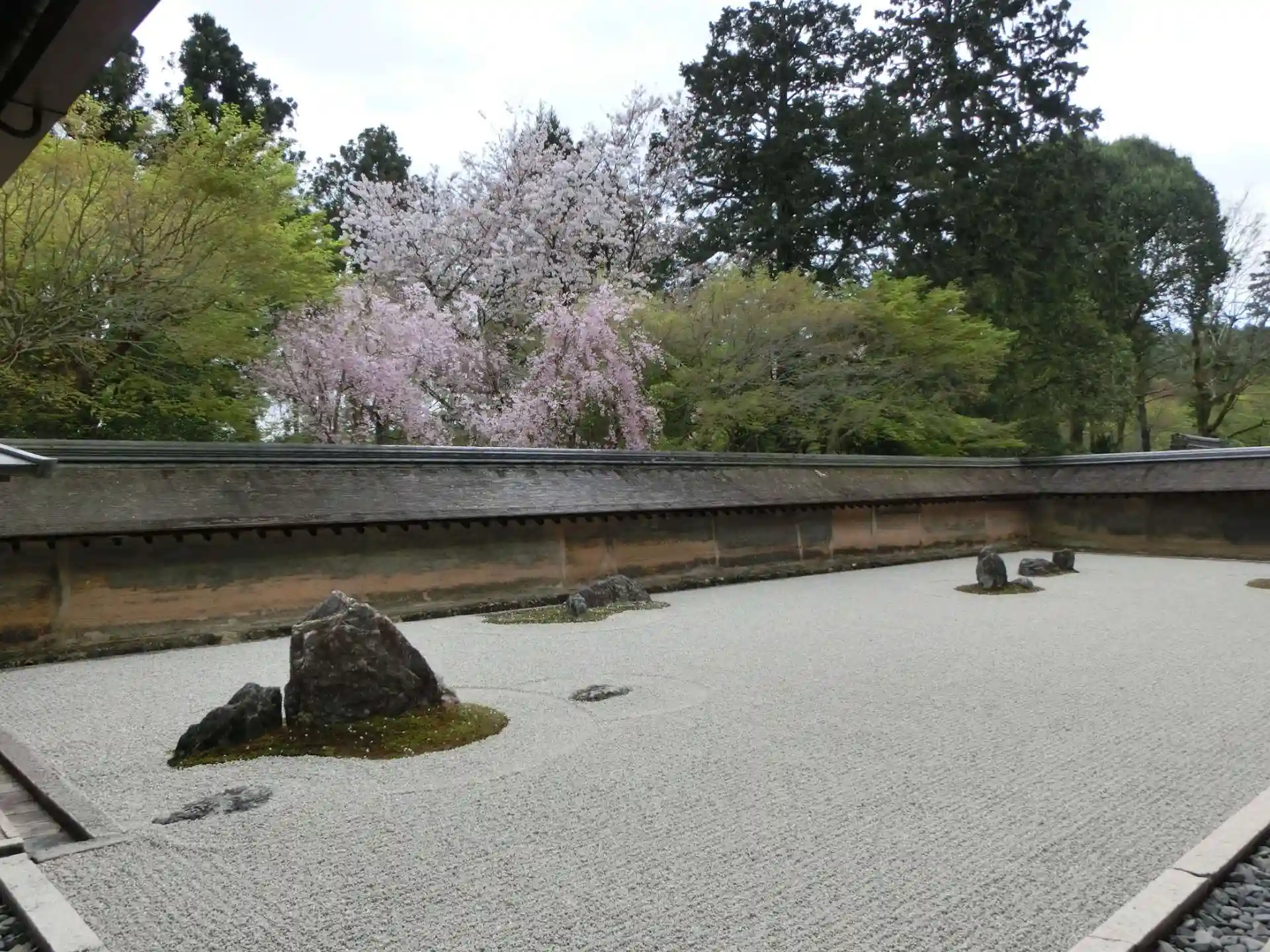 石庭は東西25m、南北10mの空間に白砂を敷き詰め、15個の石を配したもので、石は東側から5・2・3・2・3と配置されている代表的な枯山水庭園です😃