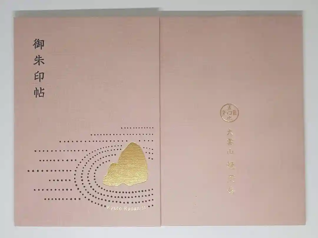 桃色の地に、表面は石庭の枯山水に「Kyoto Ryoan-ji」が入ったデザインで、左上に御朱印帖の文字、裏面は真ん中に蹲居(吾唯足知)の意匠と大雲山龍安寺の文字が入っています。