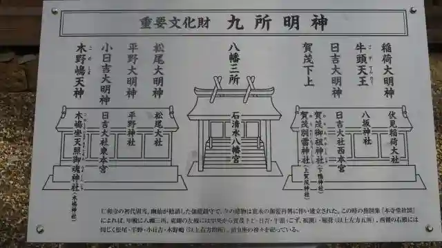 中殿に「石清水八幡宮」 を祀り、9座を3殿にお祀りしていることから九所明神とする。