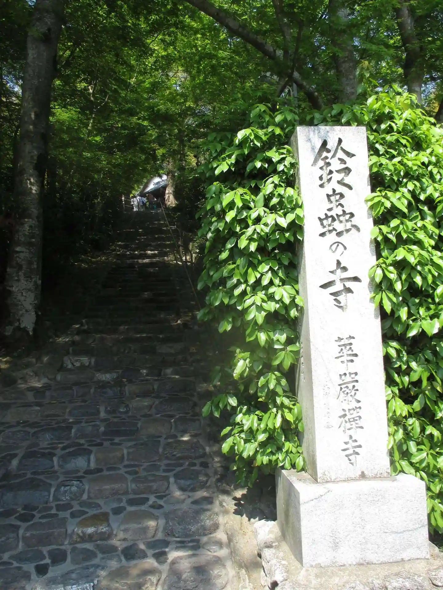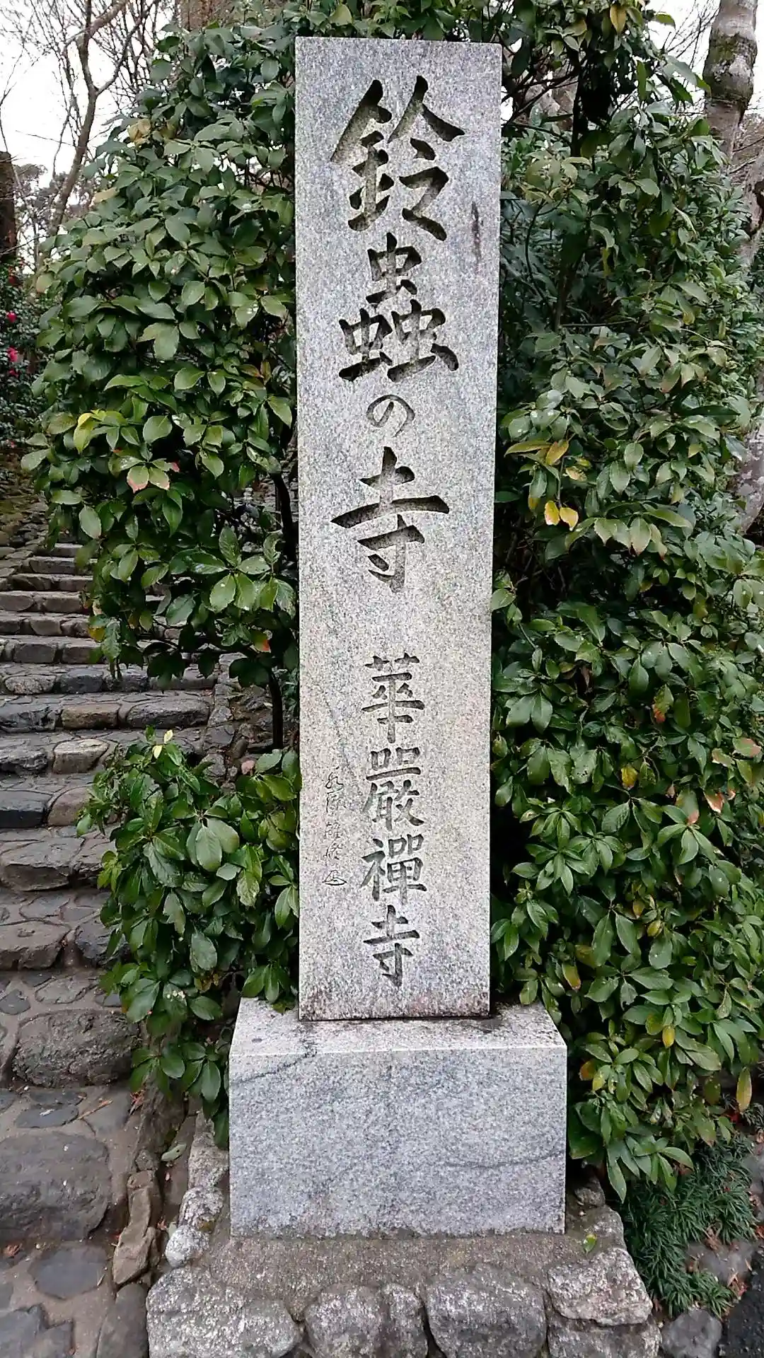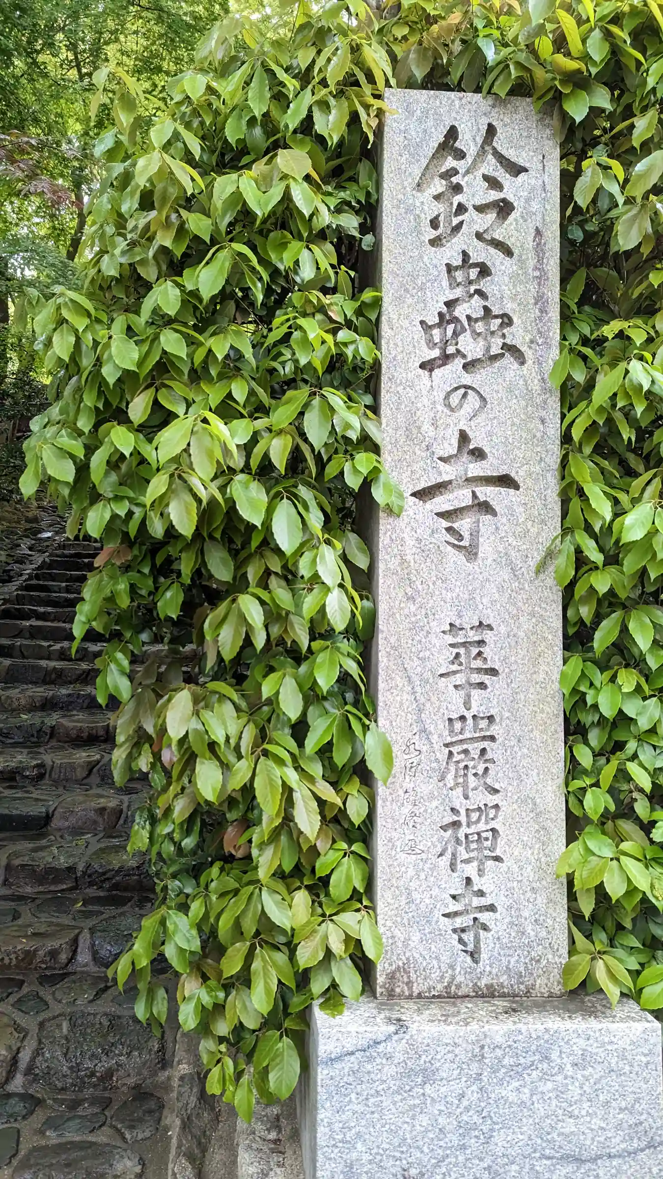 境内入口の<寺号標>。この階段を少し登ると正門(山門)がある。