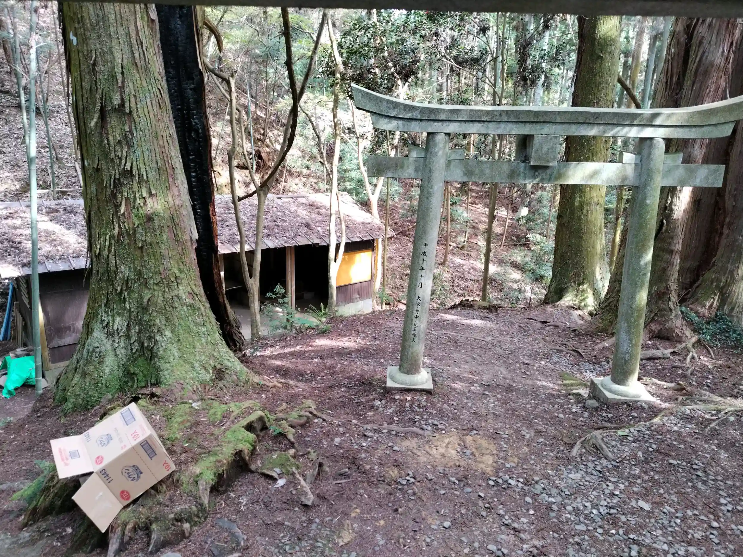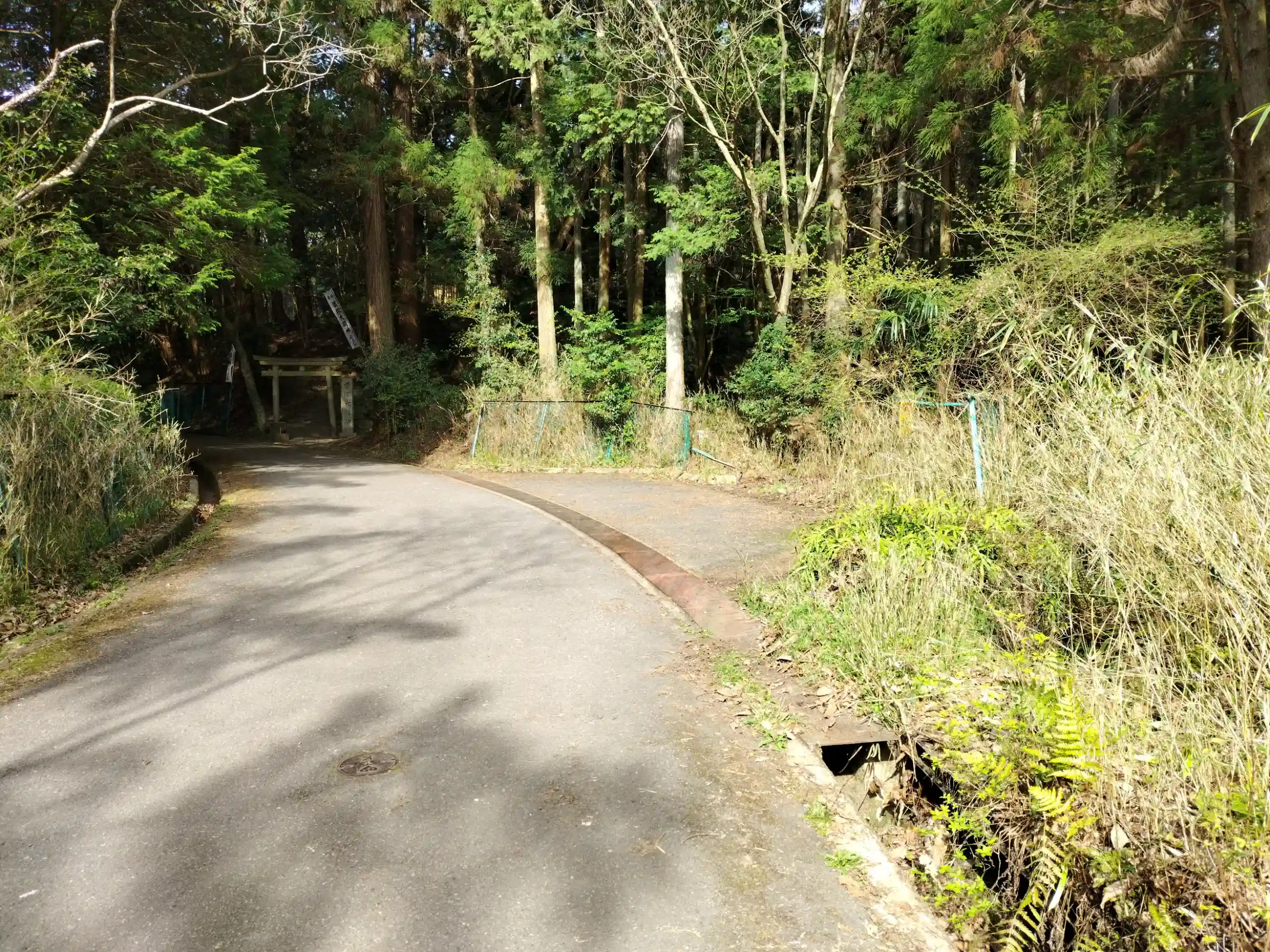 鳥居の少し手前に、ちょっと広いところがある。駐車可能だし、小さなクルマならここで転回出来る。