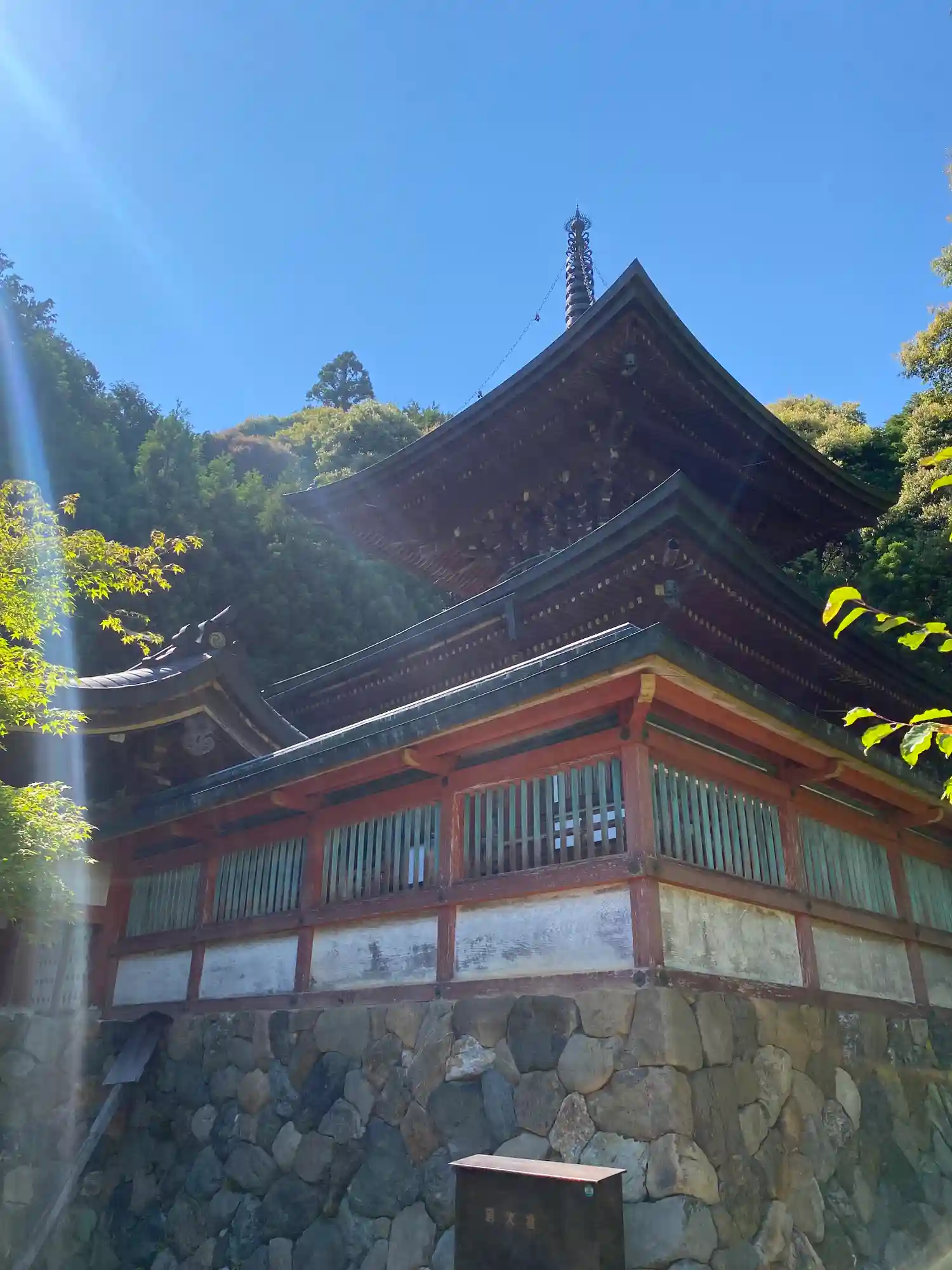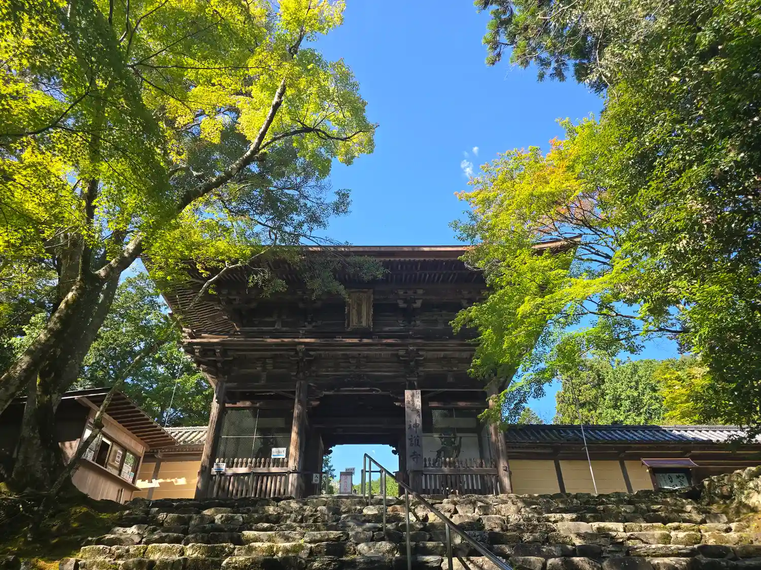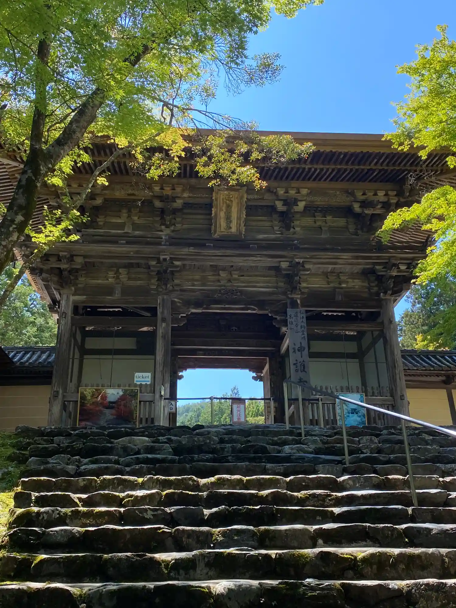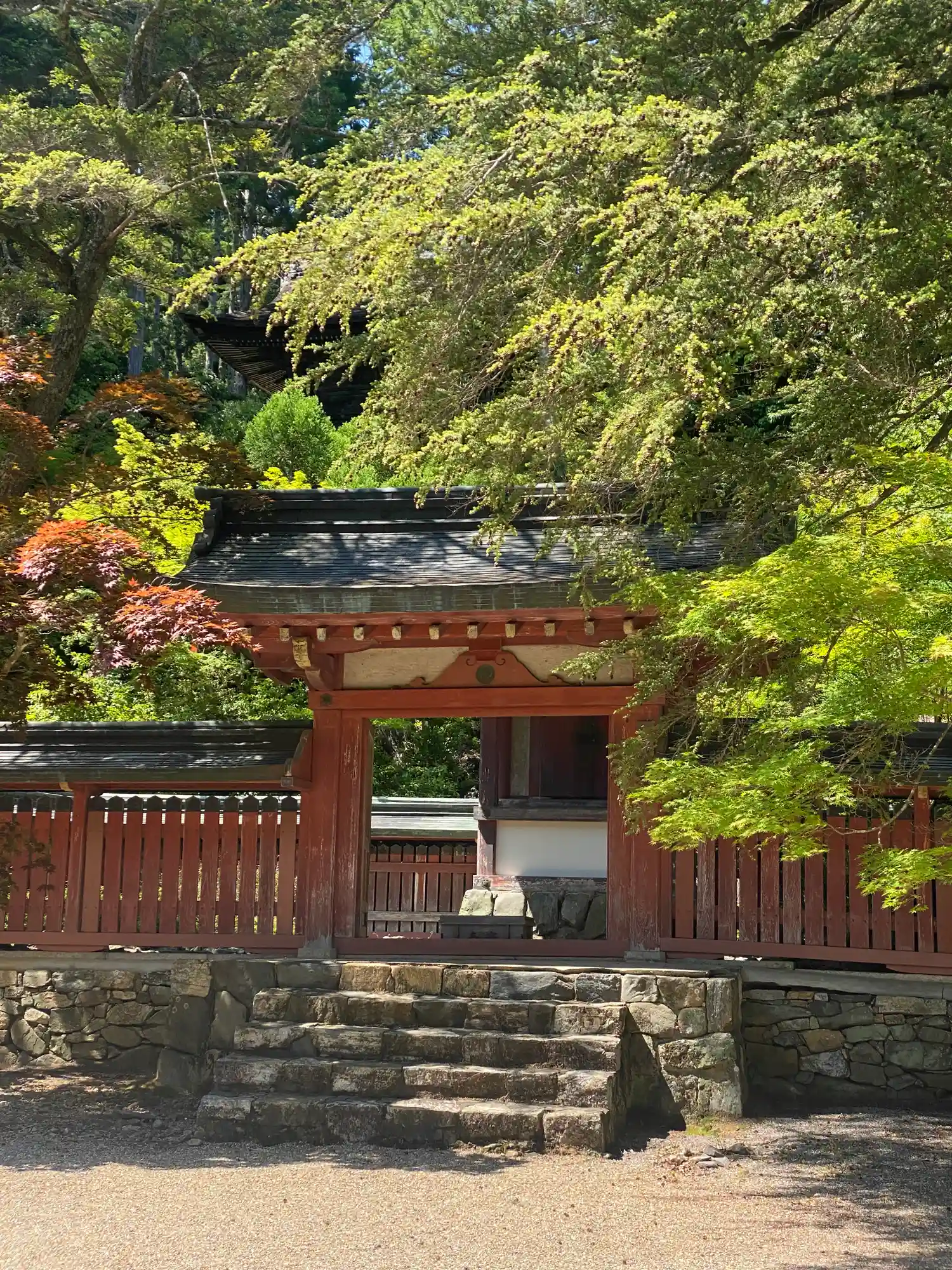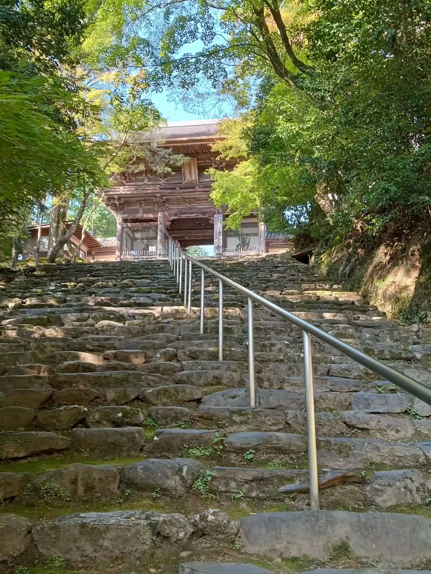 楼門は改修工事中でした。さすがは山岳寺院、境内までの長い階段で激しく息切れ中。