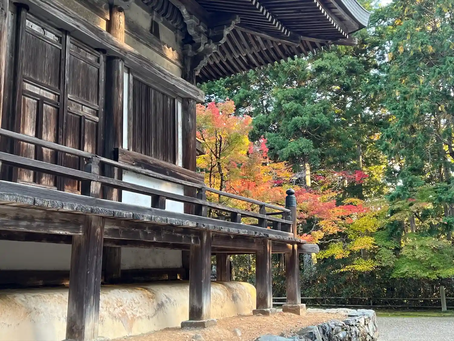 太子堂から五大堂の横を抜けると、金堂への石段前に出ます。京都のカレンダーや映像に出てくるあれです。左側の木陰の部分を進んで金堂へ。