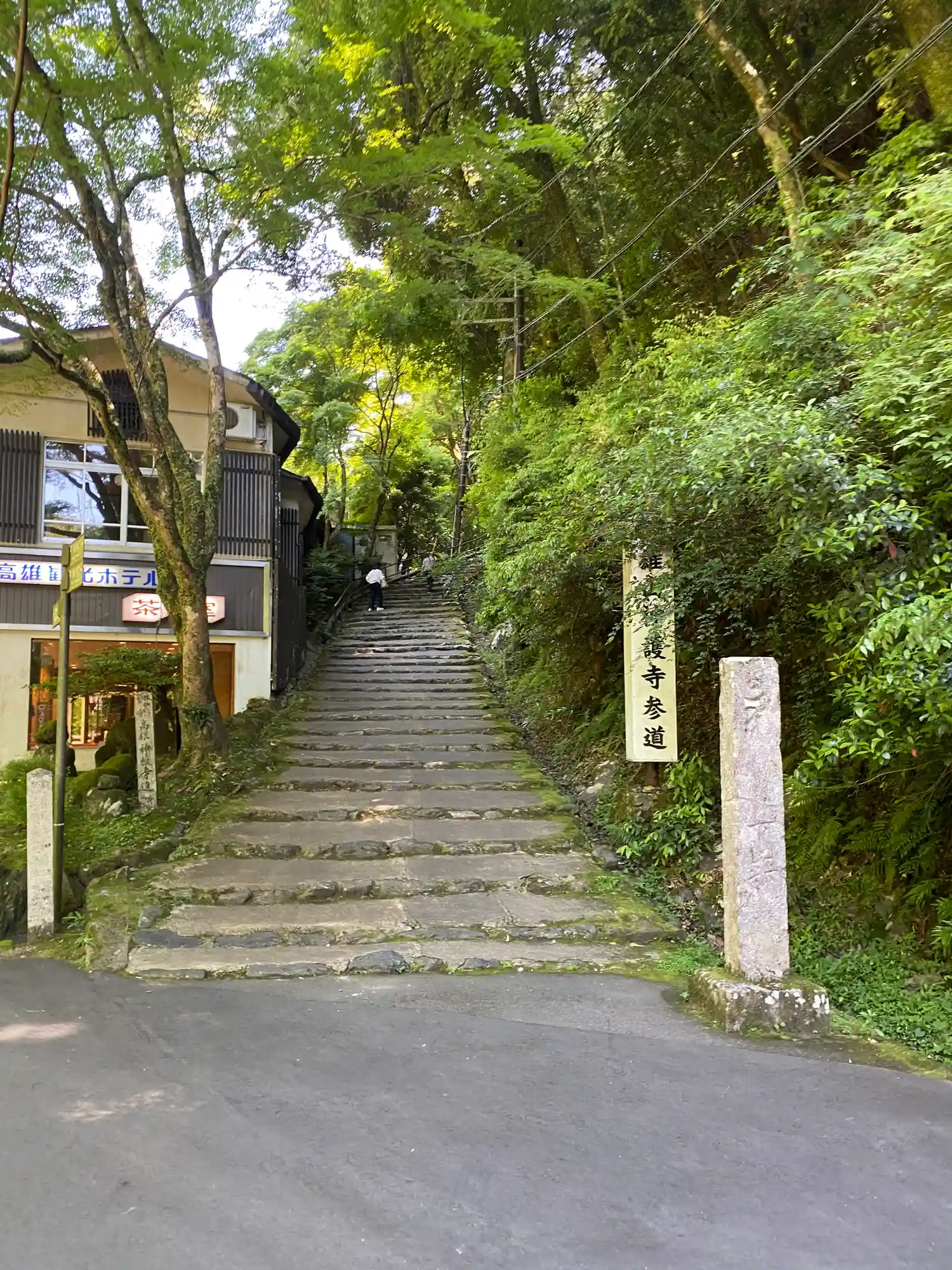 神護寺の寺号標。ここから石段が始まります。350段だそうです。山門までは健康な方で15分でしょうか。