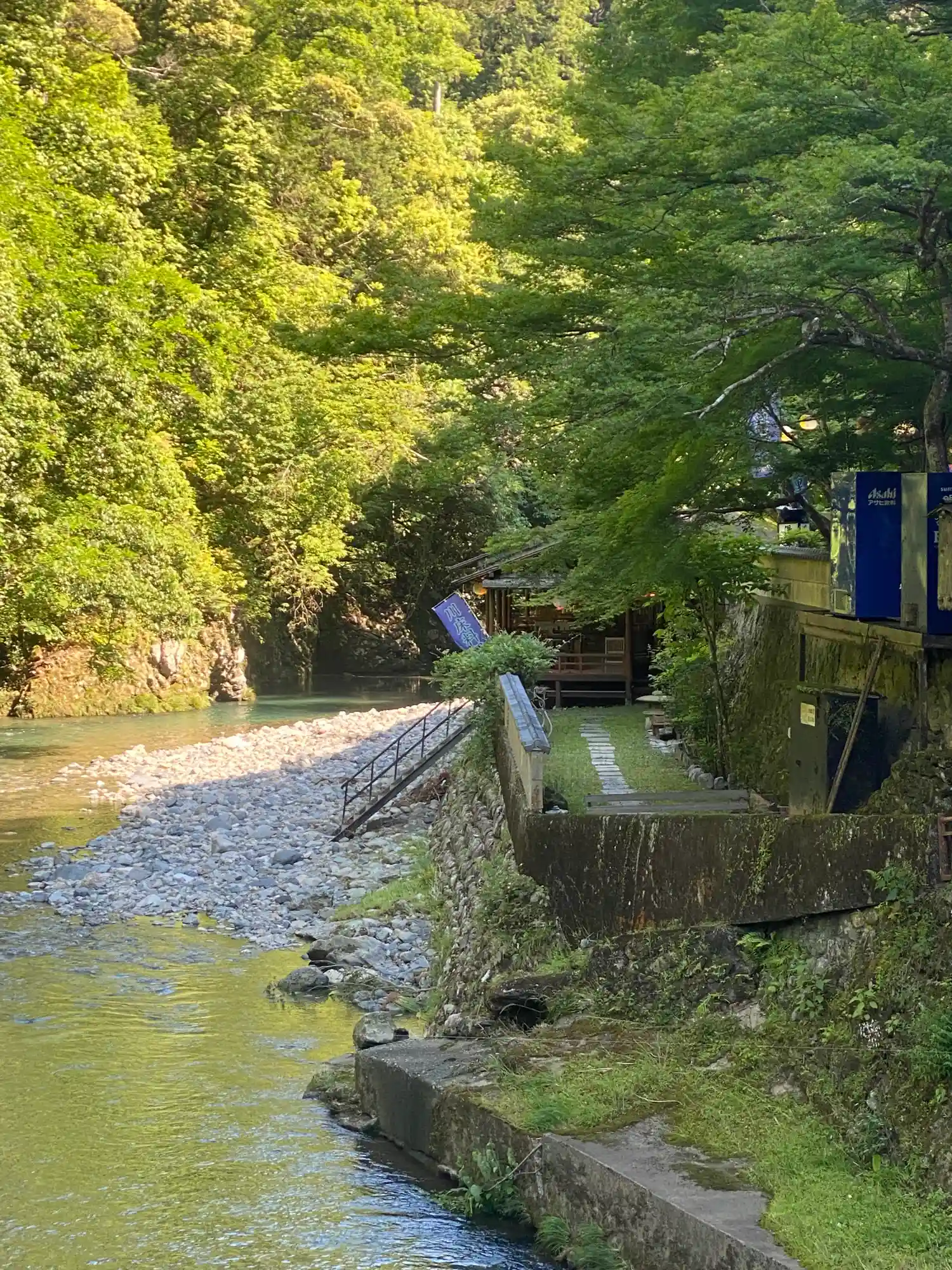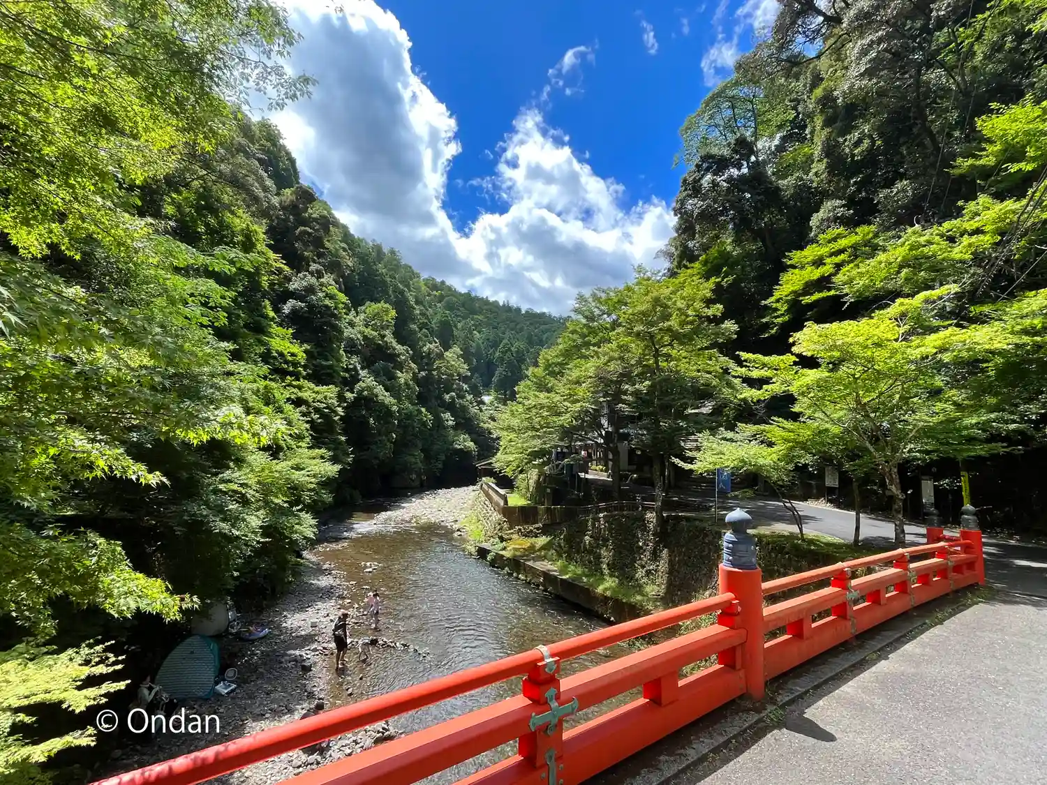高雄観光ホテルの駐車場は一時利用が可。500円です。駐車場前の清滝橋渡って神護寺へ。下の渓流は家族連れが一杯!涼しそう。