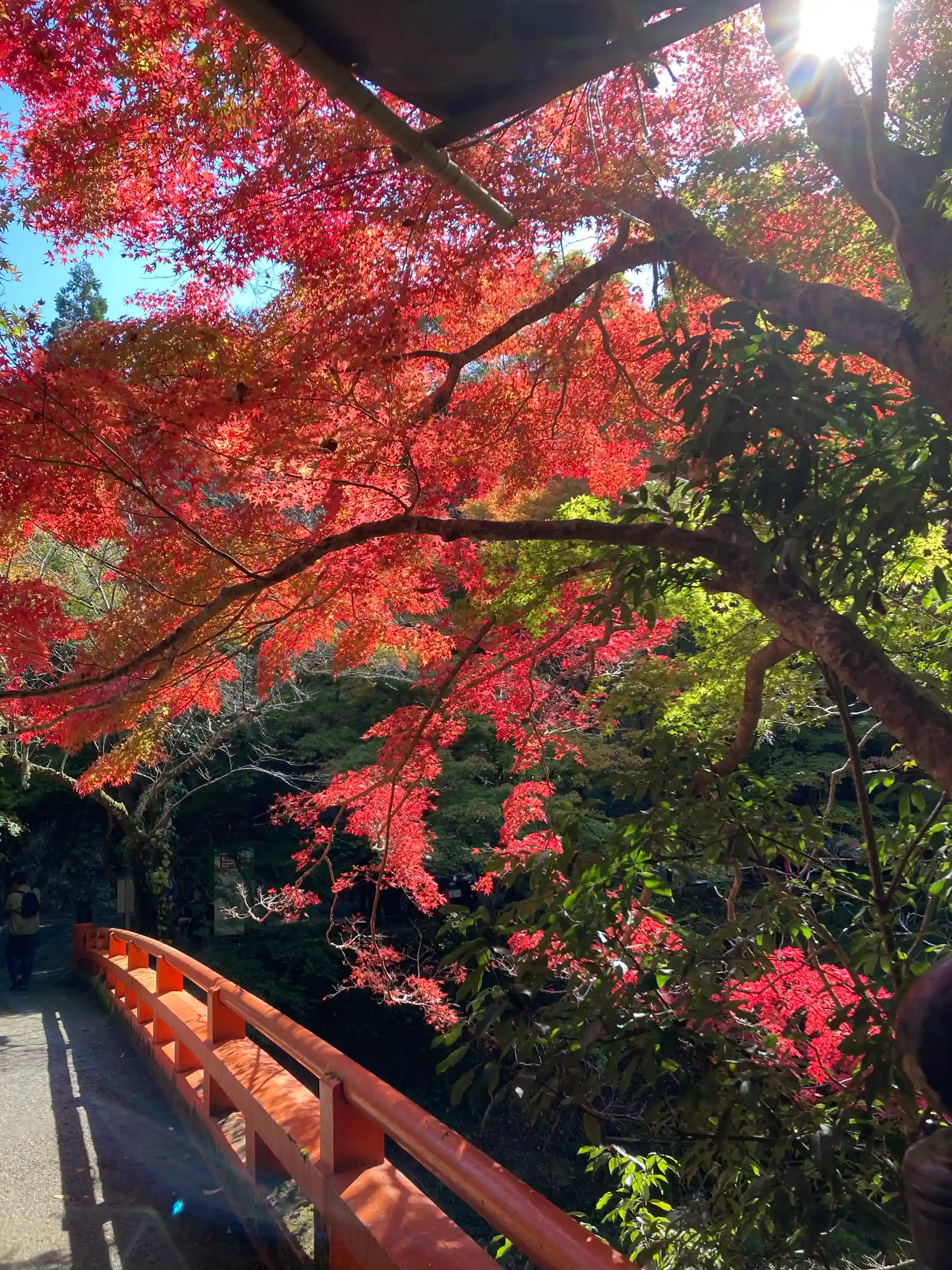 西明寺はチケット1枚。入口で朱色の橋の前の紅葉が色づいており、参拝客が多数撮影。