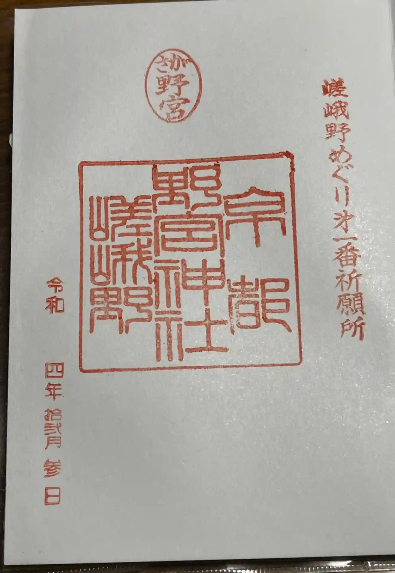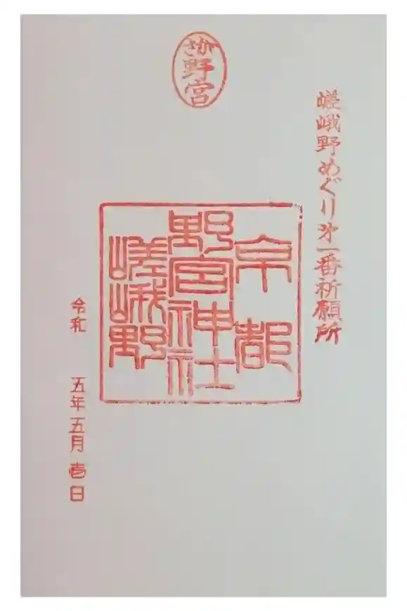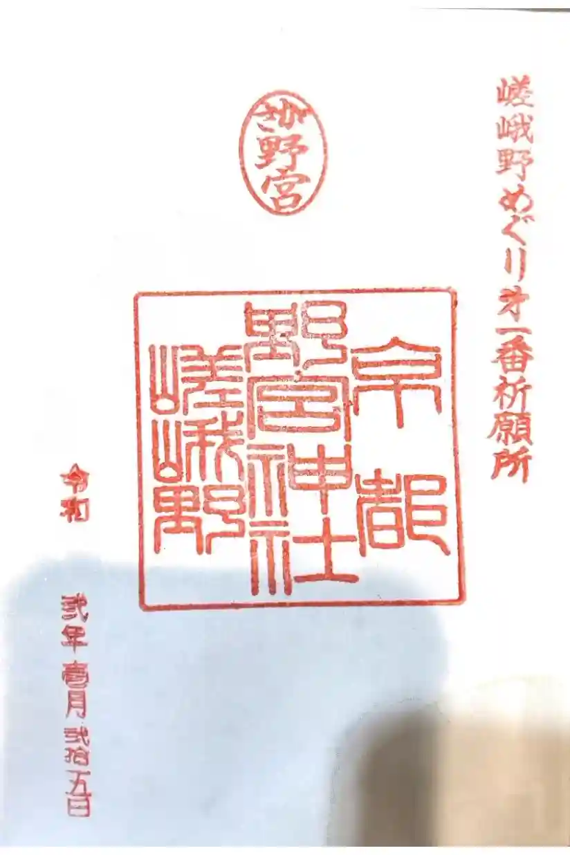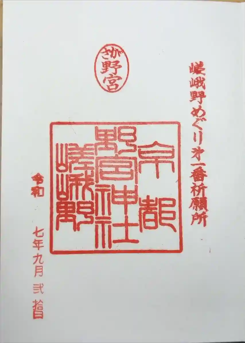 右から「嵯峨野めぐり第一番祈願所」印、真ん中上部に「さが野宮」の丸の印、真ん中に「京都 野宮神社 嵯峨野」の印が押されています。
