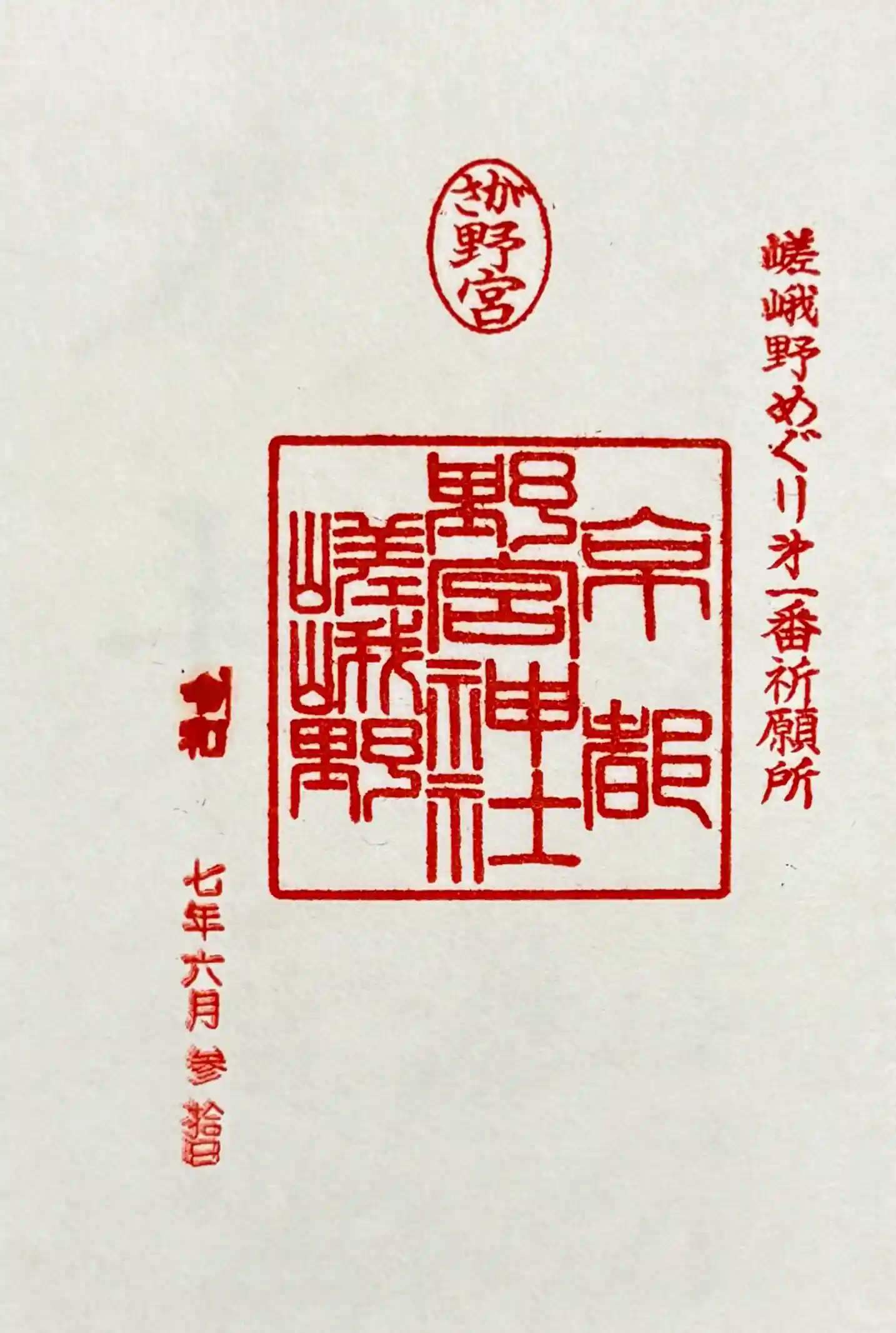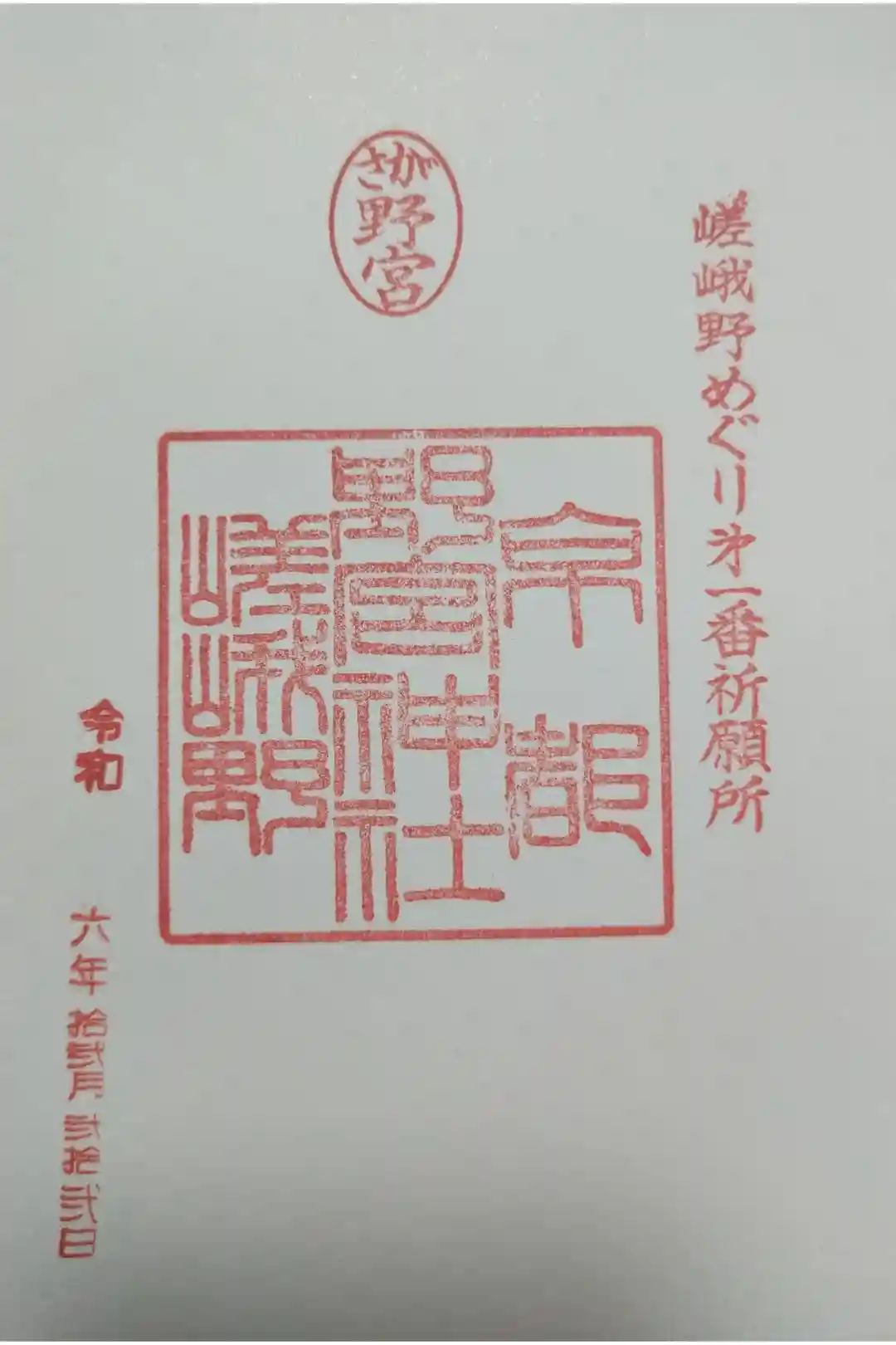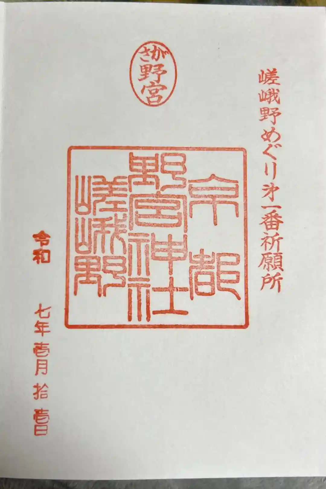 右から「嵯峨野めぐり第一番祈願所」印、真ん中上部に「さが野宮」の丸の印、真ん中に「京都 野宮神社 嵯峨野」の印が押されています。