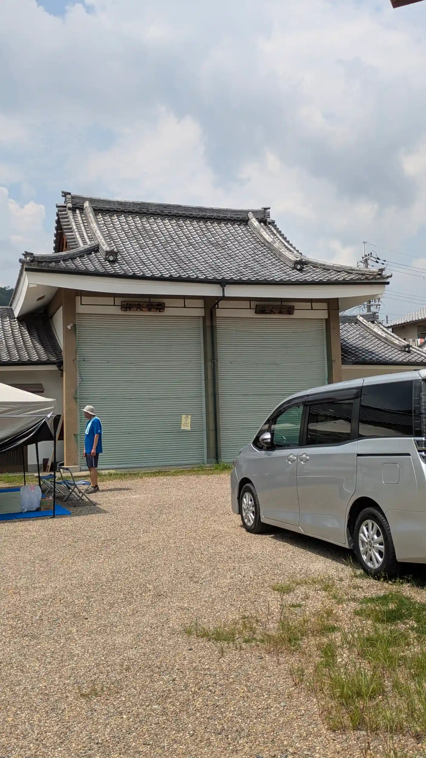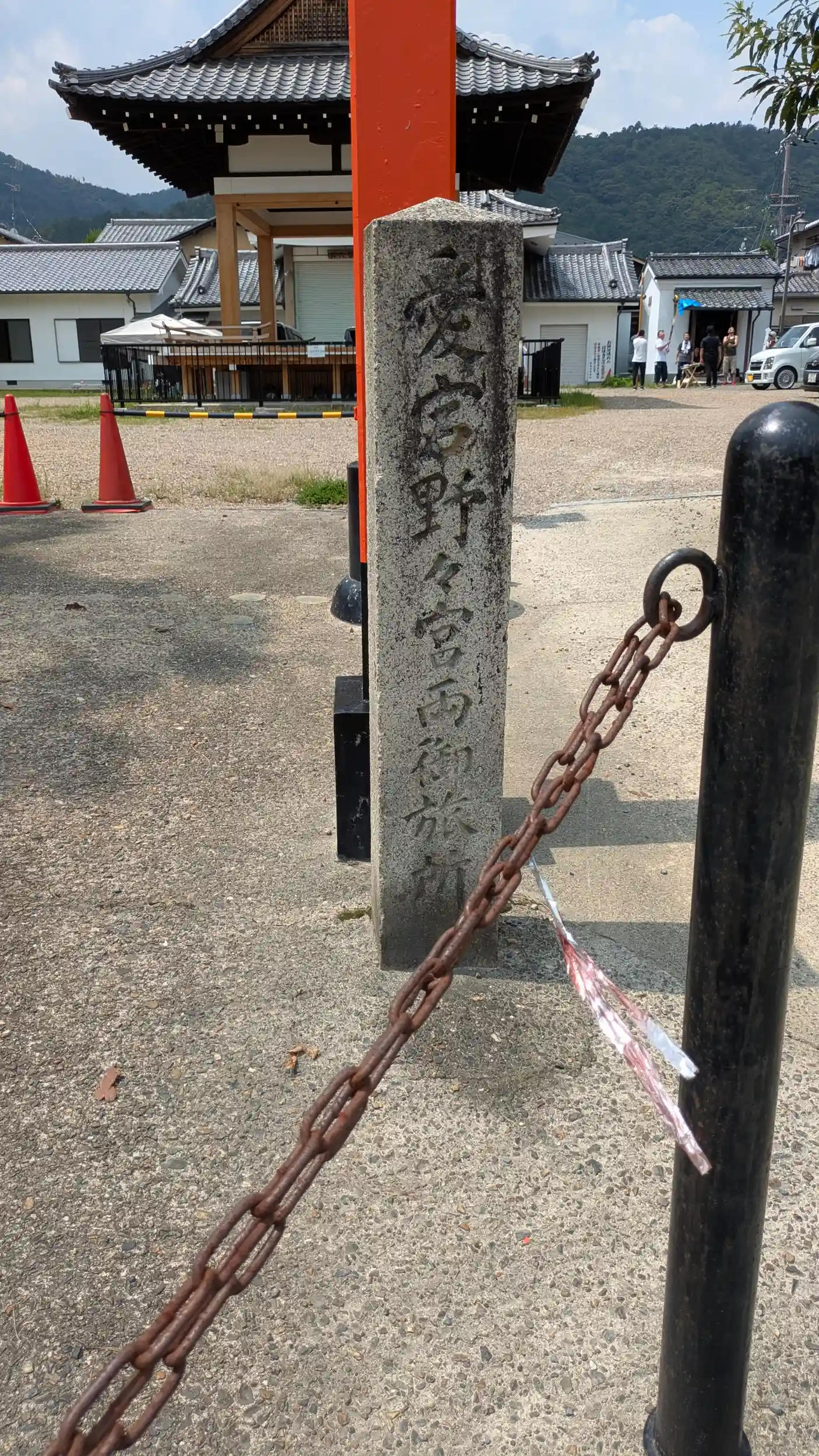 薬師寺地蔵盆特別公開のため嵯峨清凉寺へ。京福「嵐山」駅で降りるともう凄い人😱さすが嵐山のメインストリートだけあるわ・・・😅できれば日曜は避けたかったが仕方なし。嵯峨清凉寺の山門が見える辺りでは一気に人影も減り、、山門目指していると左手に駐車場と中央に拝殿?らしきものが見えたので確認。「愛宕野々宮両御旅所」の石碑がありました。境内へお邪魔すると神輿庫らしき建物の前に人が集まっていたので近く祭りでもあるのかな?と思いましたが邪魔するわけにもいかないので拝殿前でお詣りしてあとにしました。
