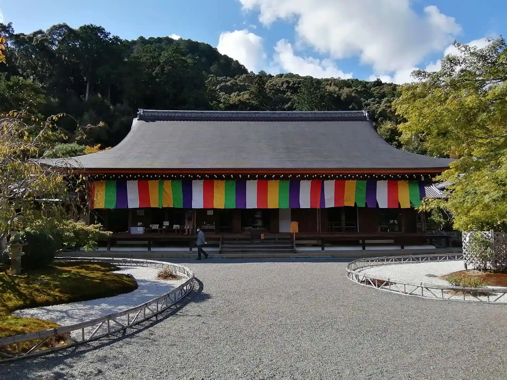 総門をくぐると拝観受付、拝観料を納めて参道を進むと「紅葉の馬場」。参道両側に多数のもみじがあり、紅葉していたらさぞ見事なことでしょう。黒門か勅使門から本堂前へ、とても綺麗に手が入れられています。