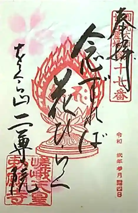 真ん中に「念ずれば花ひらく」と描かれ、右上に圓光大師廿五霊場第十七番の印、真ん中に蓮華座に梵字(阿弥陀如来と釋迦如来)の火炎宝珠印、左下にをぐら山二尊院の文字、嵯峨天皇勅願寺の印が押されています。