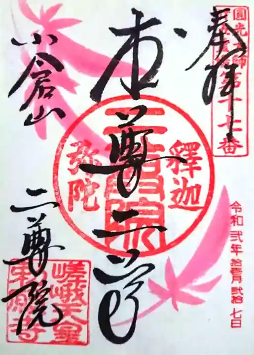 真ん中に本尊二尊と書かれ、、右上に圓光大師廿五霊場第十七番の印、真ん中に釋迦弥陀二尊院の印、右下と左上に散り紅葉が描かれ、左に小倉山二尊院の文字、左下に嵯峨天皇勅願寺の印が押されています。