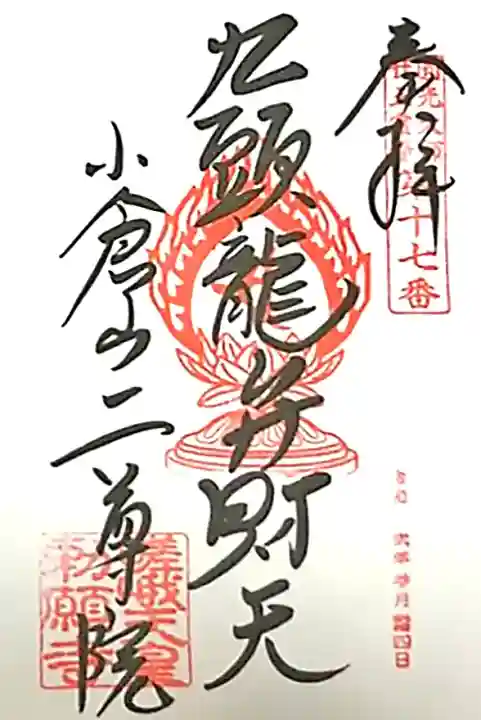 真ん中に九頭竜弁財天と書かれ、右上に圓光大師廿五霊場第十七番の印、真ん中に蓮華座に梵字(弁財天)の火炎宝珠印、左に小倉山二尊院の文字、左下に嵯峨天皇勅願寺の印が押されています。