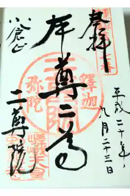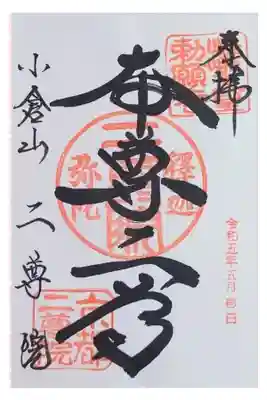 真ん中に本尊二尊と書かれ、、右上に圓光大師廿五霊場第十七番の印、真ん中に釋迦弥陀二尊院の印、左に小倉山二尊院の文字、左下に嵯峨天皇勅願寺の印が押されています。
