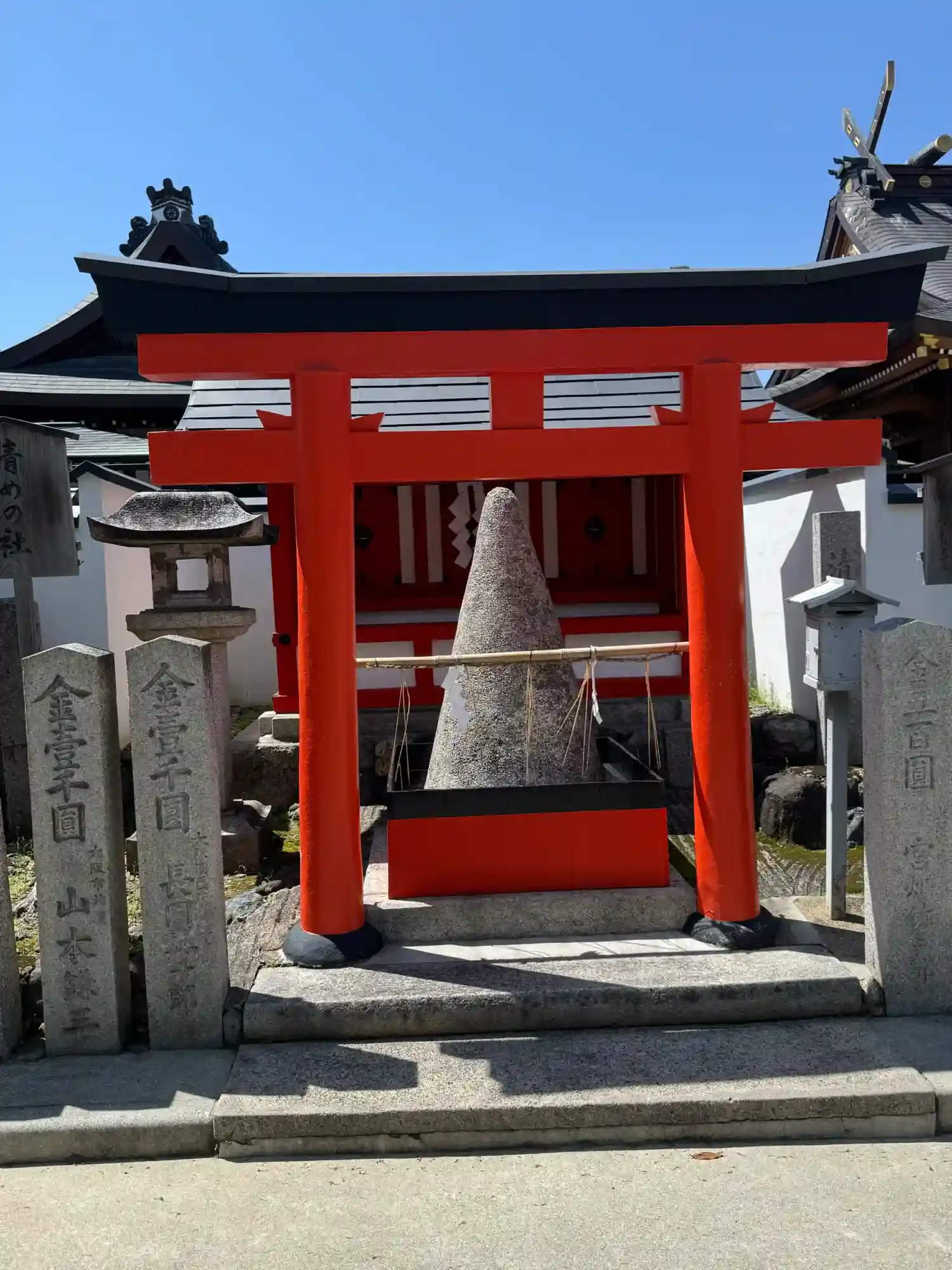 芸能人やその関係者によって奉納された約4,000枚もの朱塗りの玉垣が社殿を囲んでいます。