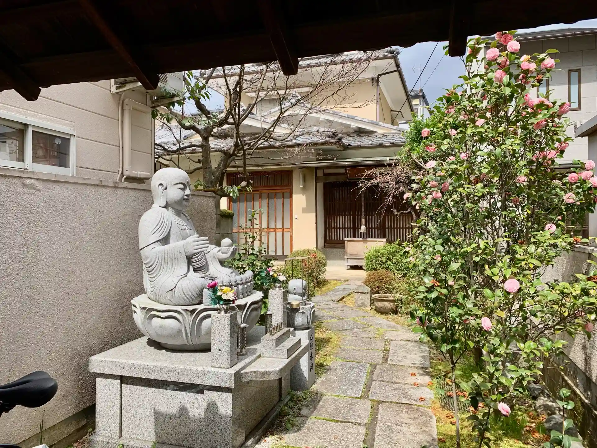 お地蔵さんと椿?お花の間の道を進めば本堂です。