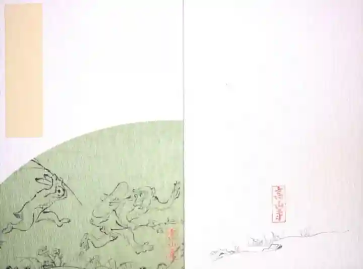 4巻からなる絵巻物で、擬人化された兎、猿、カエルなどの動物が描かれた甲巻が特に有名です。表紙にはその中の兎が猿を追いかける場面が、緑色の地にあしらわれています。裏面にも絵の一部があります。「高山寺」の文字は、高山寺でしかいただけない授与品に入っているものです。