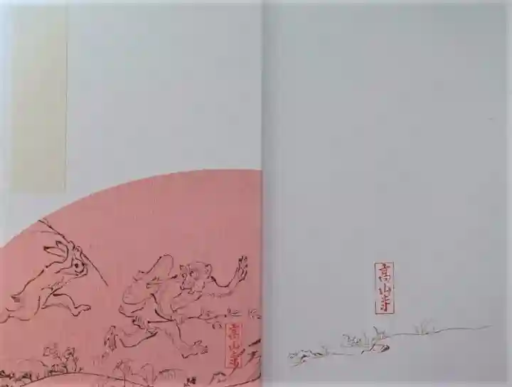 高山寺限定「国宝 鳥獣人物戯画」の御朱印帳です。表紙の絵の部分が、かわいらしいうすべに色です。
