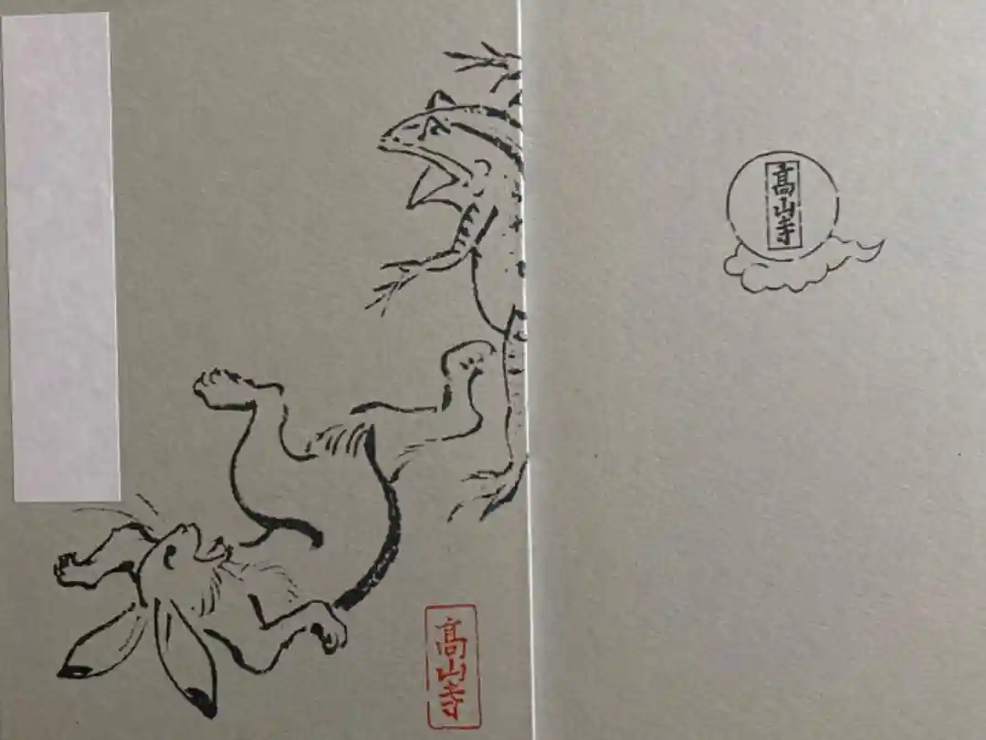 4巻からなる絵巻物で、擬人化された兎、猿、カエルなどの動物が描かれた甲巻が特に有名です。表紙にはその中の兎が猿を追いかける場面が、緑色の地にあしらわれています。裏面にも絵の一部があります。「高山寺」の文字は、高山寺でしかいただけない授与品に入っているものです。