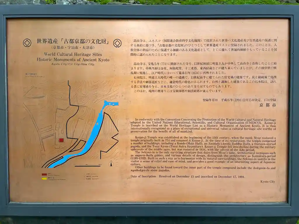 | ご由緒 | 高山寺のある栂尾は、紅葉の名所として知られる高雄山神護寺からさらに奥に入った山中に位置し、古代より山岳修行の適地として、小寺院が営まれていたようである。今の高山寺の地には、奈良時代から「度賀尾寺」「都賀尾坊」などと称される寺院があり、宝亀5年(774年)、光仁天皇の勅願で建立されたとの伝えもあるが、当時の実態は明らかでない。平安時代には、近隣の神護寺の別院とされ、神護寺十無尽院(じゅうむじんいん)と称されていた。これは、神護寺本寺から離れた、隠棲修行の場所であったらしい。