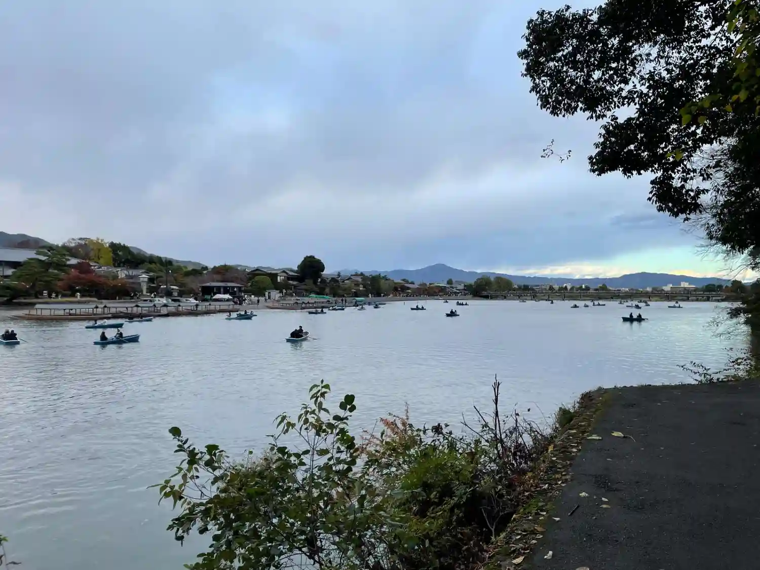 鳥居の目の前は桂川で ボートを楽しむ人でいっぱいです。