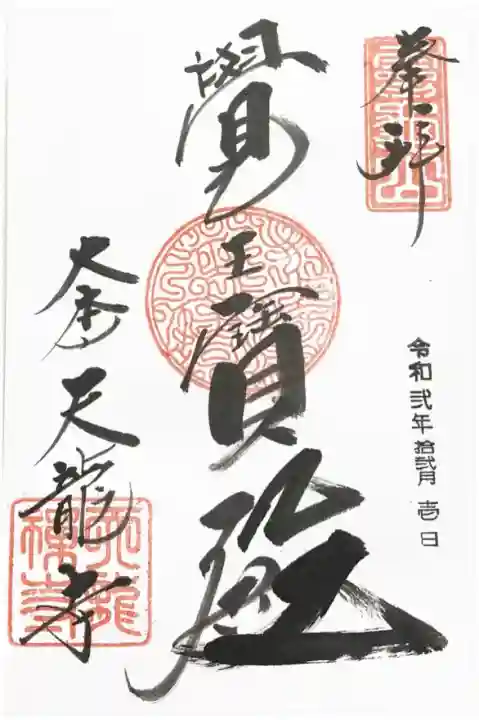 真ん中に覚王寶殿、右下に大本山天龍寺と書かれ、右上に霊亀山の印、真ん中に印、左下に天龍禅寺の印が押されています。