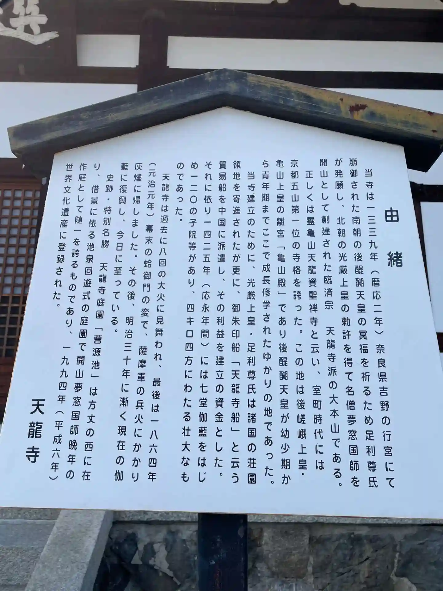 尊氏は後醍醐天皇の菩提を弔うために北朝の治天の君である光厳上皇に奏請し 院宣を以って南朝の離宮であった亀山殿を夢窓疎石を開山とする寺院に大改装した。