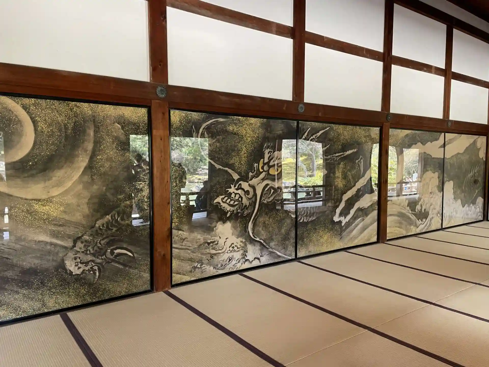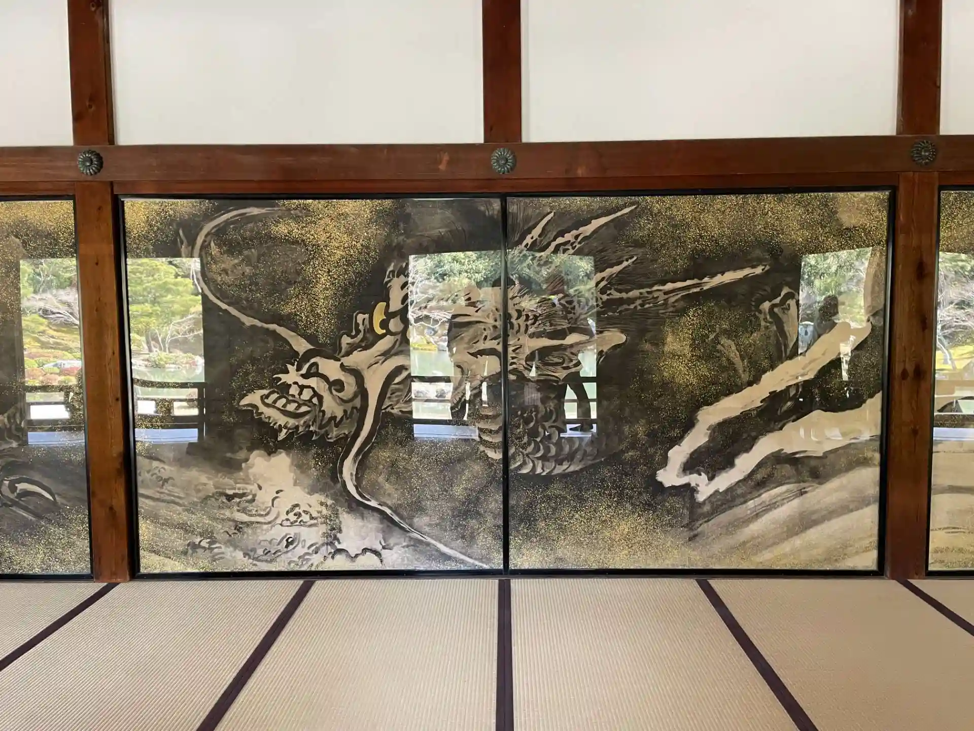 襖絵の雲龍図が見事ですが ガラスが反射して見にくいです。
