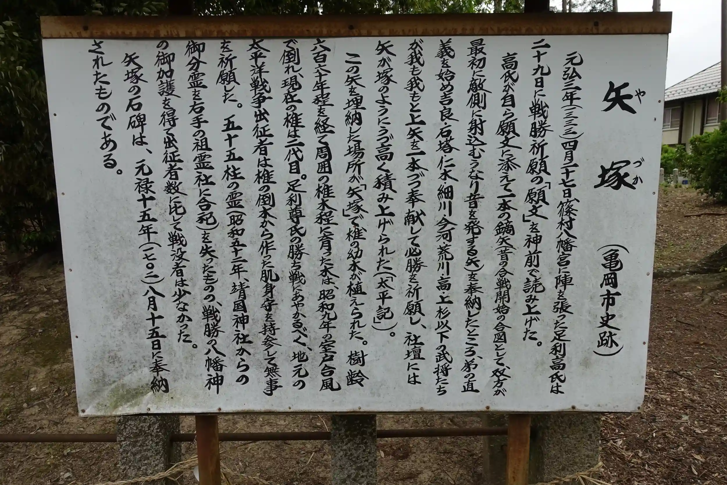 足利尊氏が挙兵した地として知られ、境内には「矢塚」や「旗揚げの地碑」などがあります。
