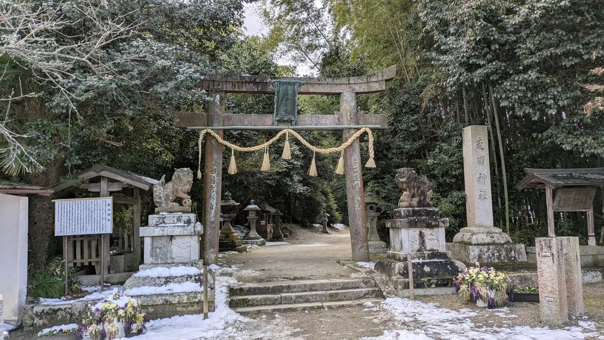 西岸寺から穴太寺へ向かう途中でいつものGoogleMapにてお見掛けしたのでお詣り。神社の前に大きな茅葺の家があり、玄関に近づくと走田神社社務所😲さすがに驚きました😅まあ先にお参りと思い鳥居の方へ。由緒によると711年の創祀とあるのでなかなかの古社。御祭神は「彦火火出見命・豊玉姫命・彦波瀲武盧茲草葺不合尊」の三柱。初代天皇である神武帝の父神と祖父母神を祀るお社に建国記念日にお参りできたのはお導きでしょうかね?向日市にも同名の走田神社がありますが関係性は不明とのこと。まあ長岡京のは「はしりだ」なので読みは異なりますが果たして・・・。社務所不在でしたのでお話は聞けずでした😂