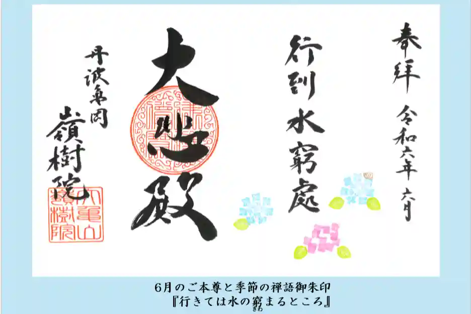 水の流れを辿るがごとく、自然に身を委ねてみる。心という静かに自然と一体化して悠々と時を過ごしてみるご本尊と季節の禅語御朱印。という意味の禅語とご本尊・如意輪観音菩薩を表した御朱印。