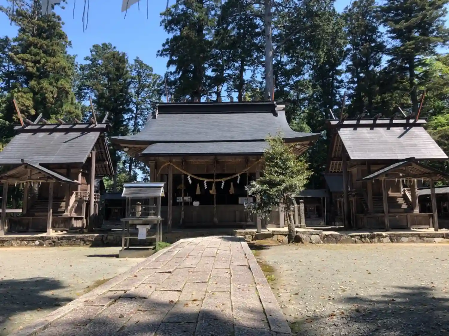 真ん中の本殿の後ろに二本のご神木。ちょっとわかりにくいですが。向かって左が龍燈の杉、右が龍燈の檜。