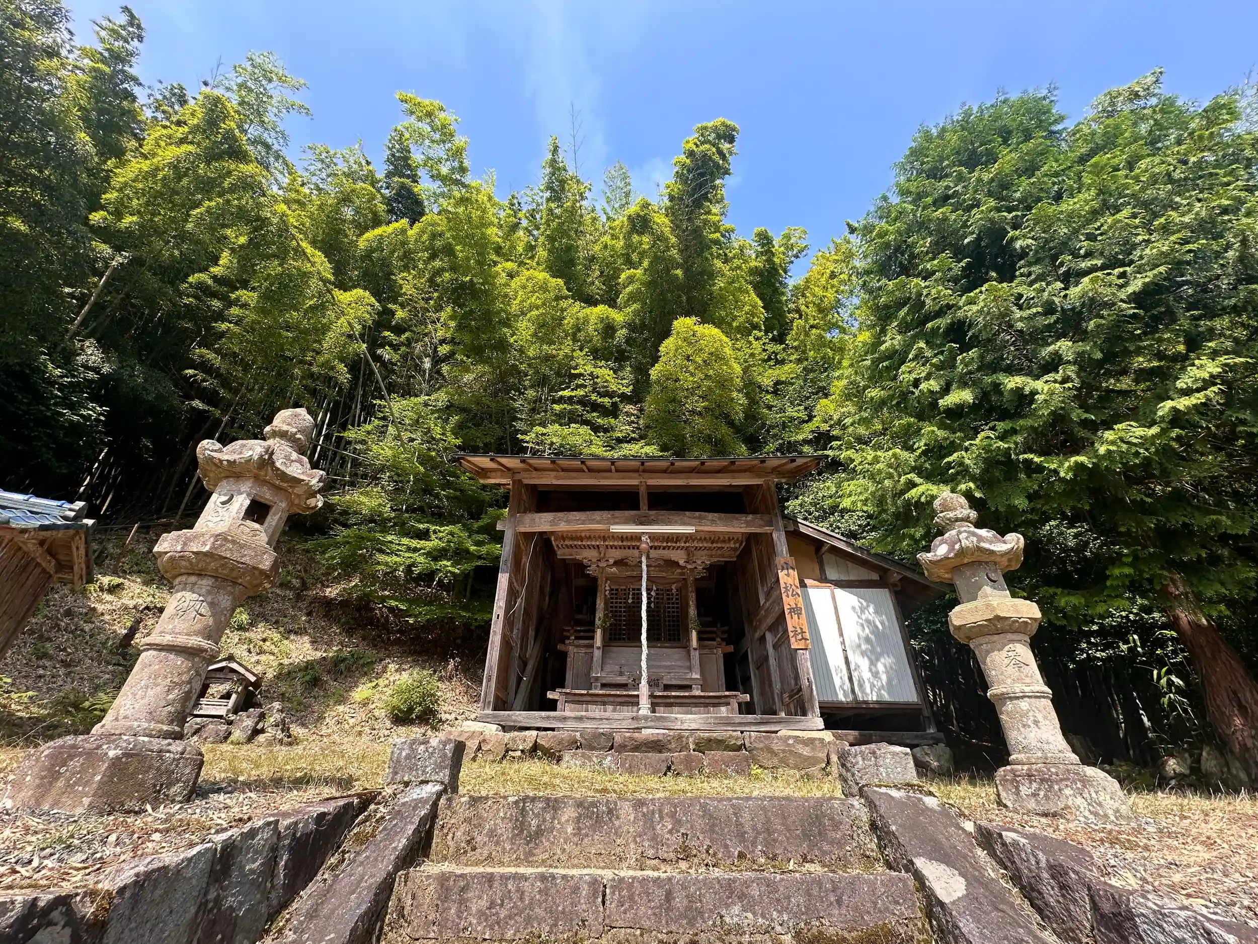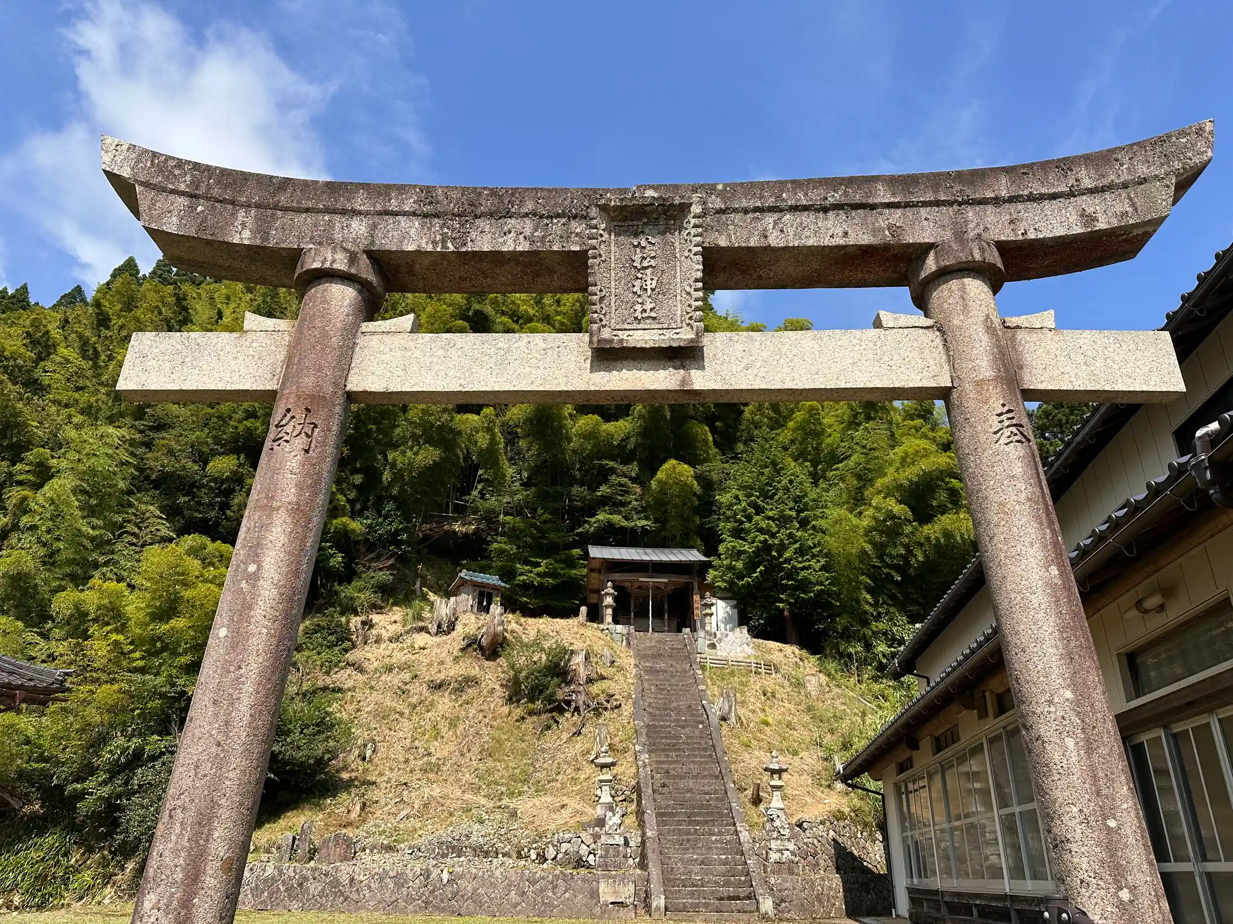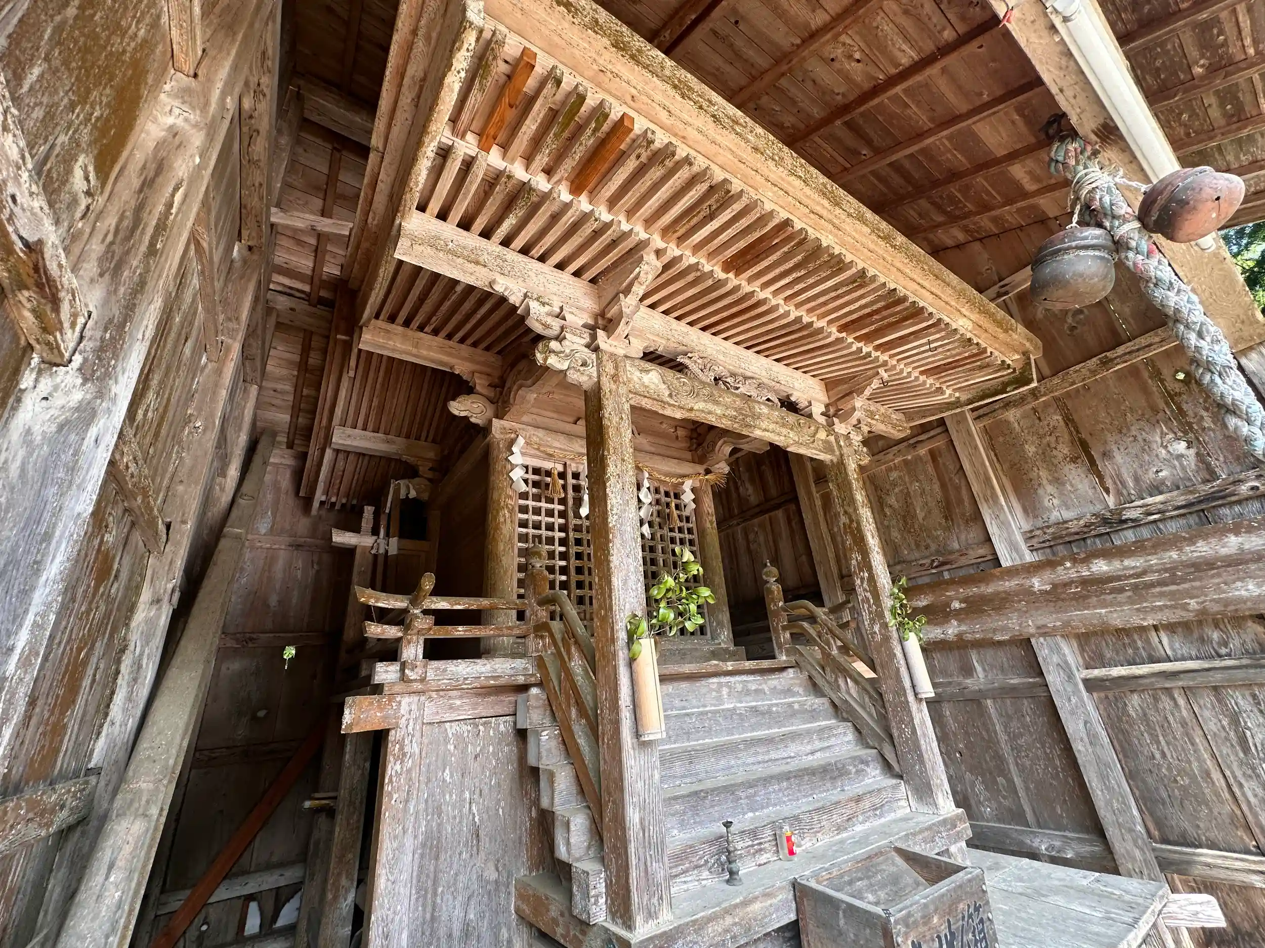 境内からは集落が一望できます、境内社に須賀神社もあります。本殿に木製扇形付鉾と御幣、秋葉神社と荒神社の御幣が残存しているようです。ハチの巣もありましたので参拝時にはご注意を!