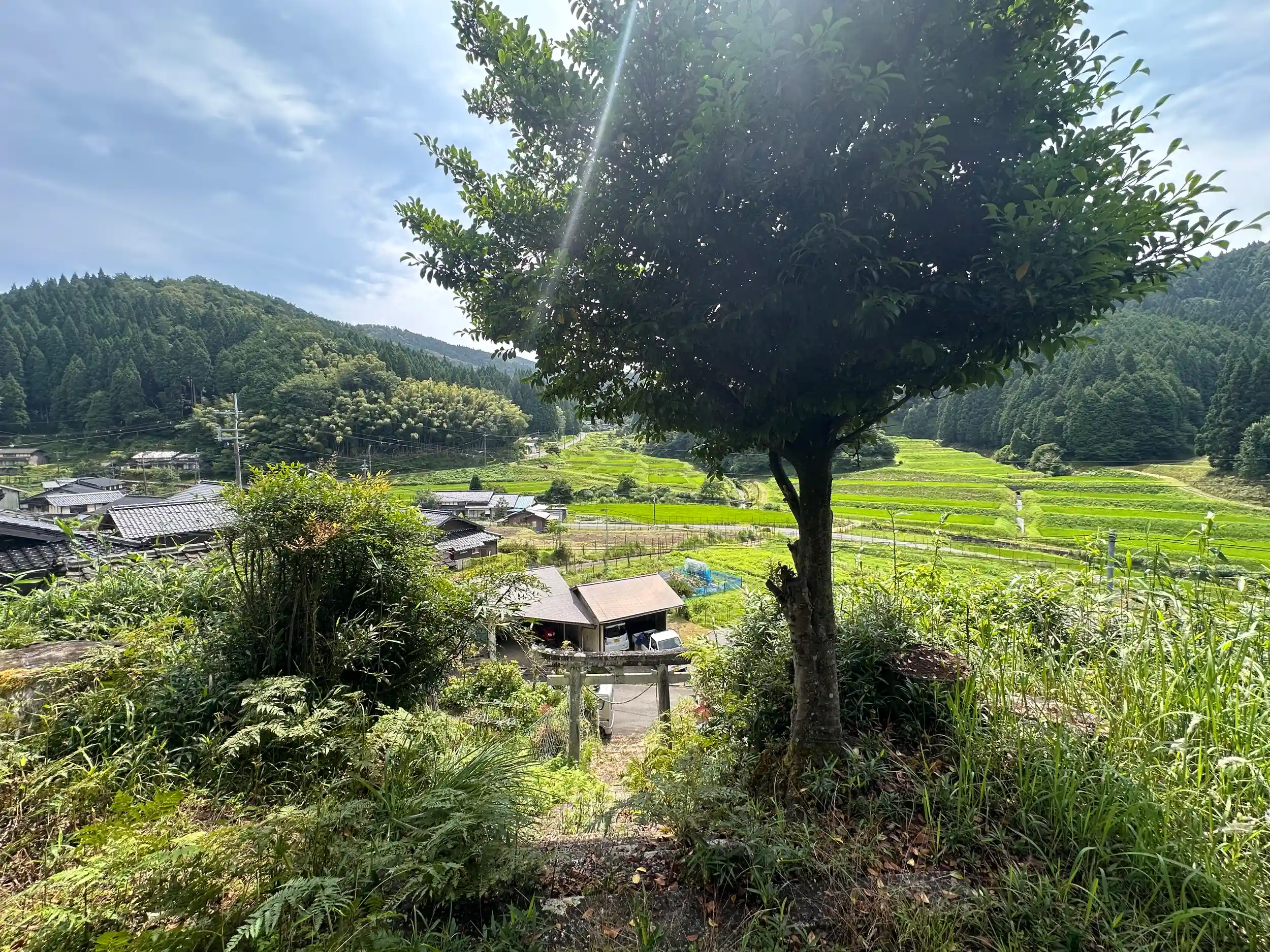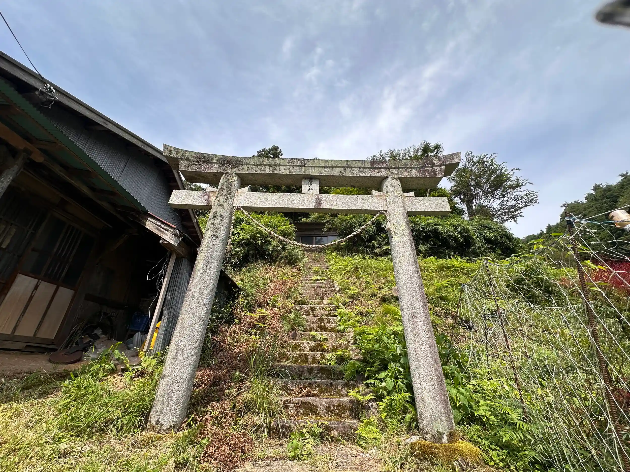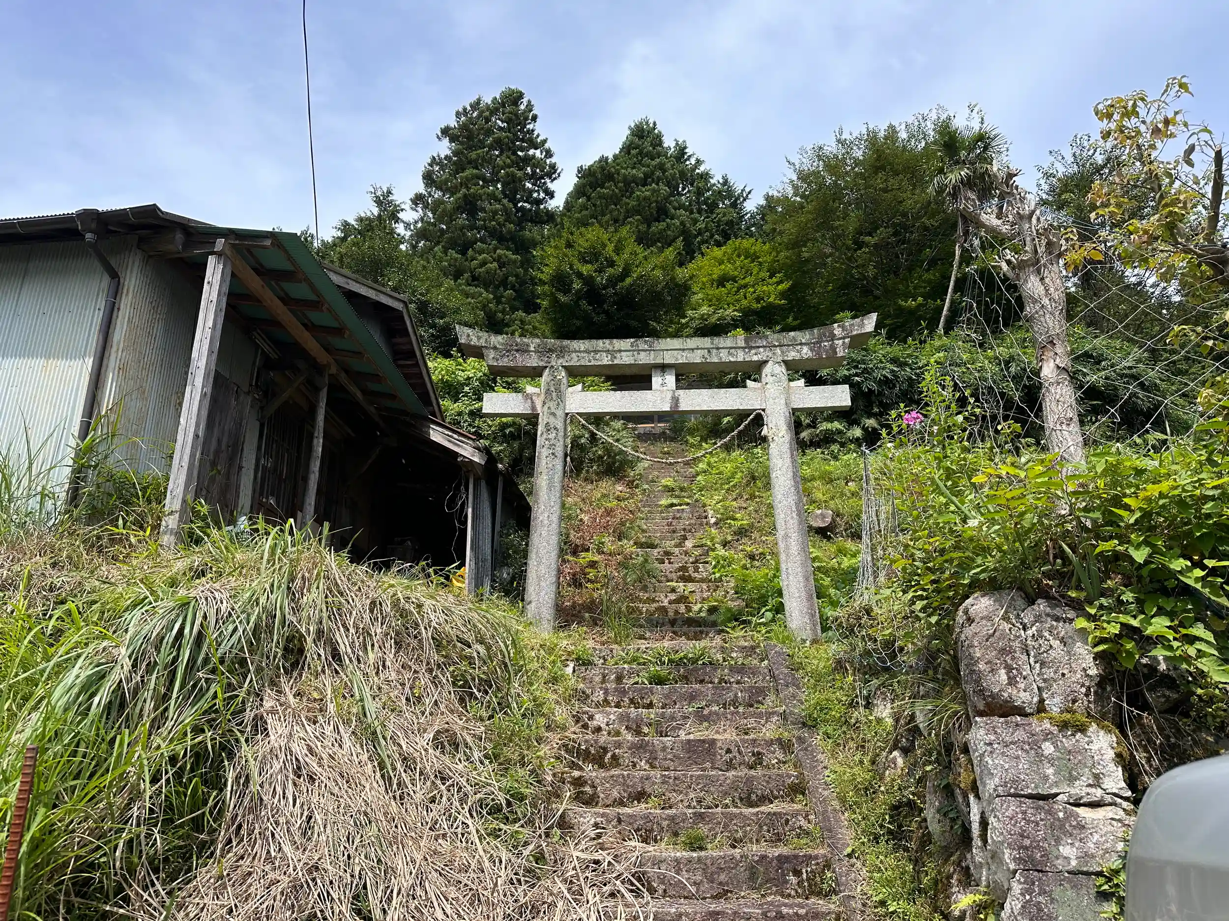 十数件の集落の端に鎮座されています、御祭神は応神天皇。参拝直後に集落の人たちが草刈りを始められました、「1km先には大生部兵主神社があり、この神社には集落の人以外は全然来ないのに珍しいな」と言われましたが、「お参りしてくれてありがとう」ともいわれました 小さいけれど地域の方が大切にされて後世に残されていることに感謝です