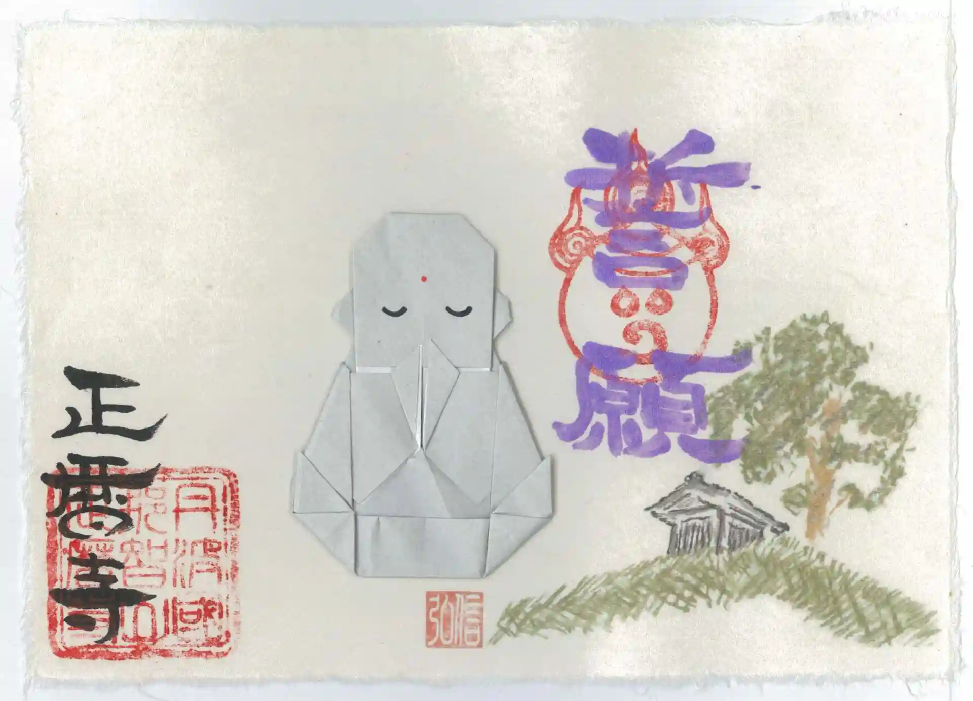 今回は、檀家さんに折紙が得意な方がおられたので、特別にお地蔵さまを折っていただき、それを貼り付けています。お地蔵さまの色は、選択はできませんが、灰色を基本としていくつかの色があります。御了承ください。後ろの地蔵小屋は、地元の綾部市鍛治屋町の丘の上に建つものをイメージしました。