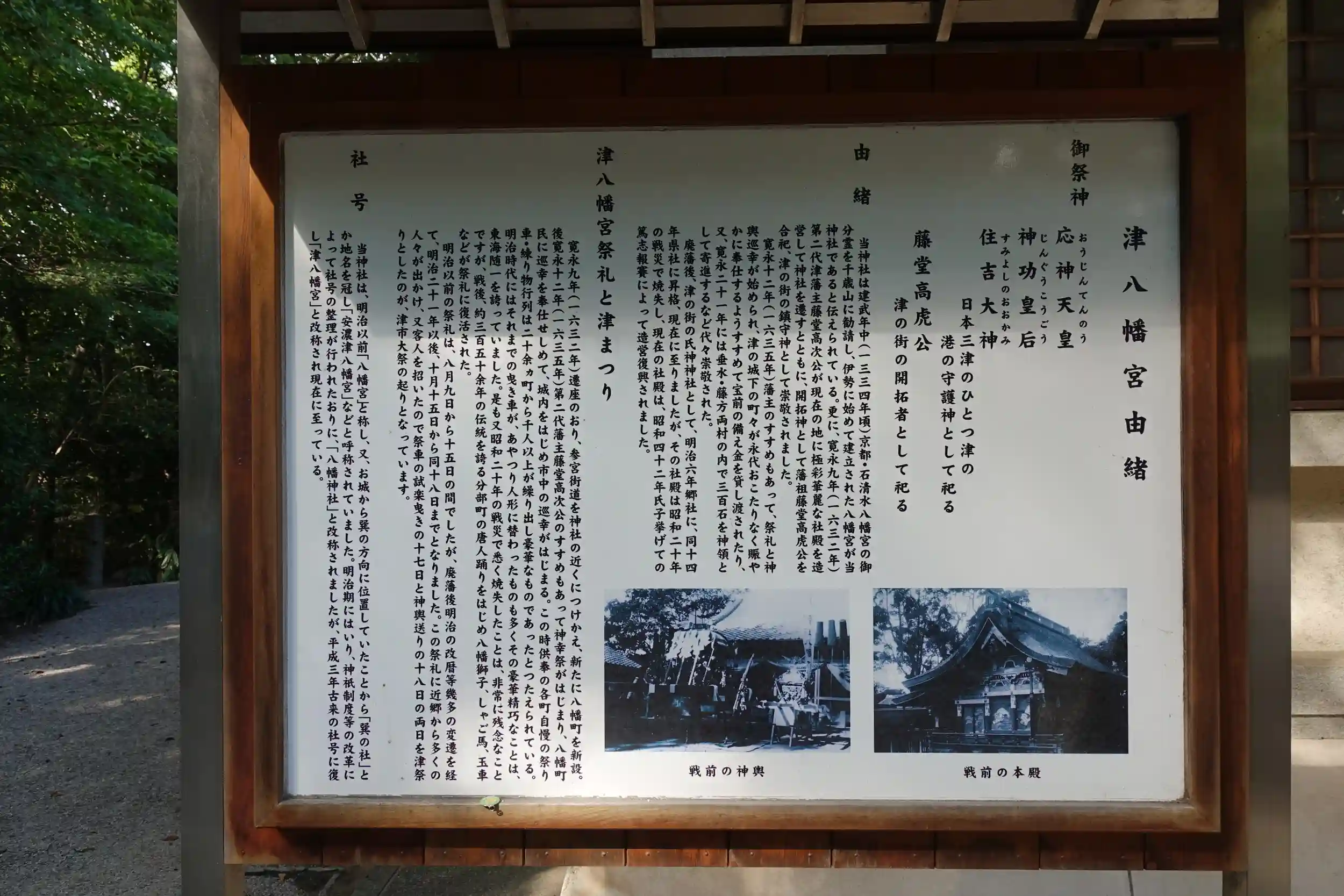 寛永9年(1632年)当時の津藩主であった藤堂高次公が千歳山より現在地へ遷座し、藤堂高虎公の御霊を合祀した。