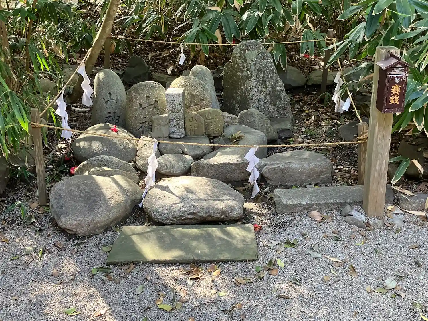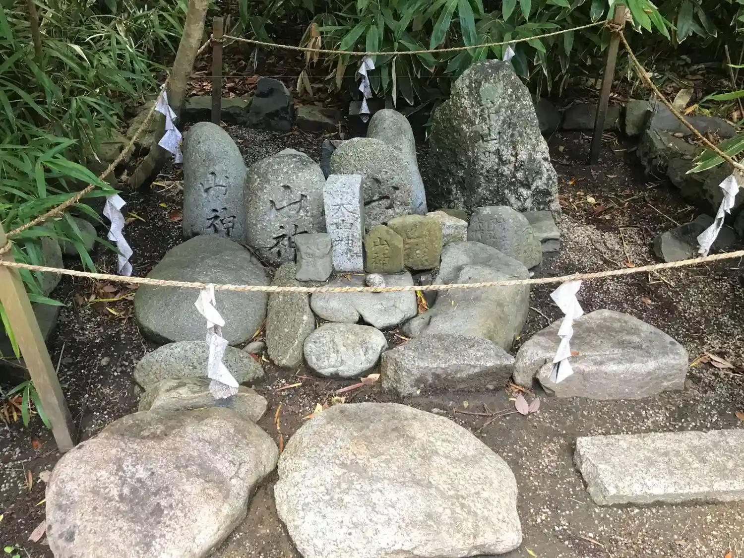 社殿の左側にある石群。「大山神」と書かれた石柱の周りに「山神」と書かれた丸石がたくさん。