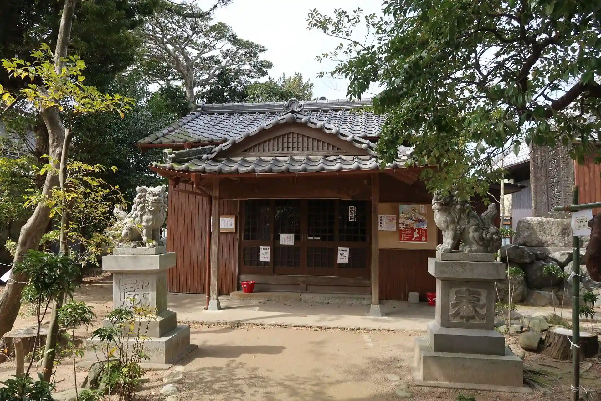 祭神は、譽田別命(ホンダワケノミコト)、神八井耳命(カミヤイミミノミコト)、大日霎命(オオヒルメノミコト)、天児屋根命(アメノコヤネノミコト)、豊宇氣比賣命(トヨウケビメノミコト)。