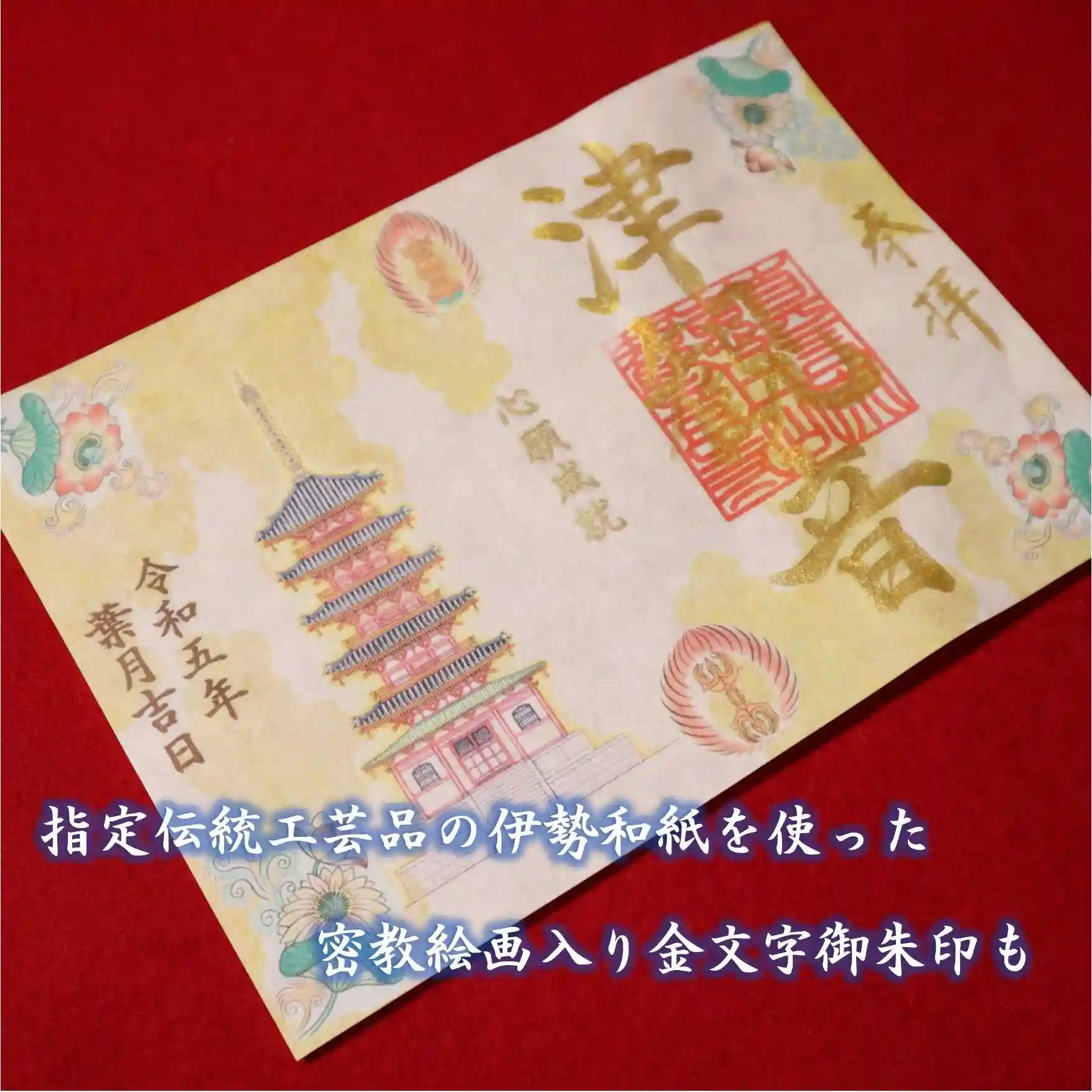 ⭕紙面には、津観音の五重塔が、四隅と上下には曼荼羅等の密教絵画で用いられる蓮華や金剛杵が描かれています。