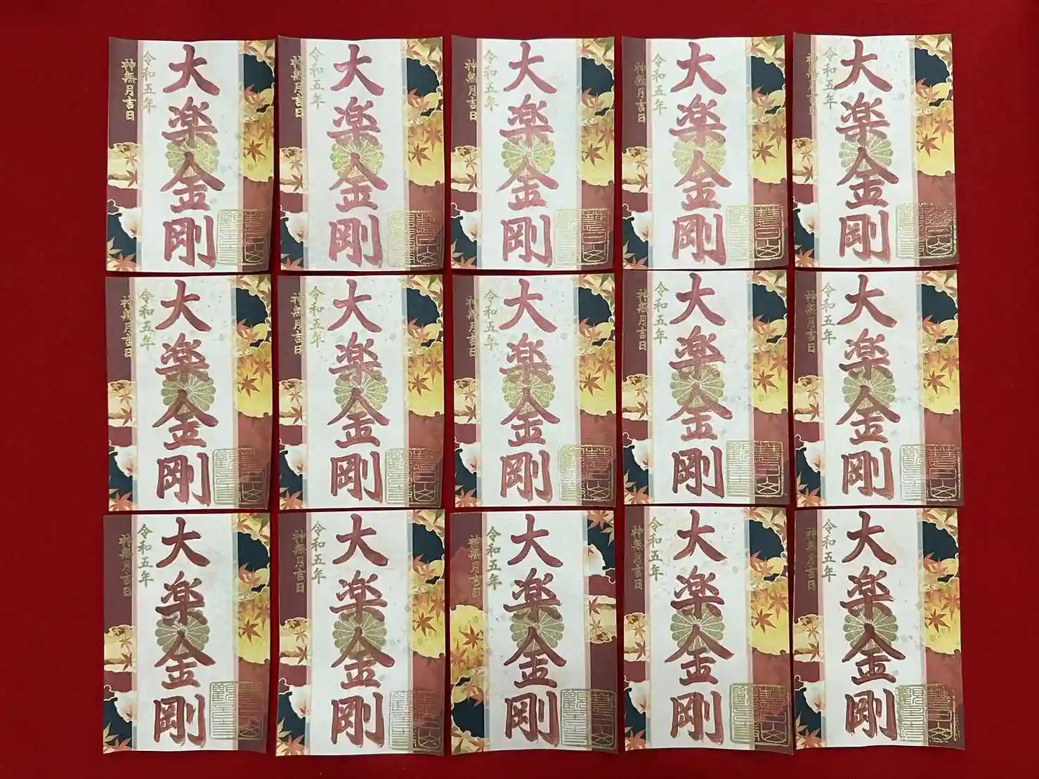 製作に手間がかかるので限定100枚です。文字や紙質、印等は毎回変わります✨️秋ですので紙には紅葉をデザインした飾り紙を用い🍁秋の名月をイメージして金色の印が押印されています🌕文字は真言宗で大切にされている経典『理趣経』から引用されております。『大楽金剛(たいらくこんごう)』とは、大楽:仏様の悟りの境地は、金剛:ダイヤモンドのごとく堅固で嘘偽りがない、という意味です。